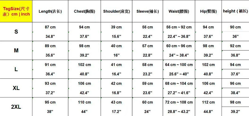 S: ширина плеч 39 см, обхват груди 94 см, Рукав 56 см, длина топа 87 см, обхват талии 56-92 см, обхват бедер 94 см, длина брюк 90 см M: ширина плеч 40 см, обхват груди 98 см, рукав 57 см, длина топа 89 см, обхват талии 60-96 см, обхват бедер 98 см, длина брюк 92 см L: ширина плеч 41 см, обхват груди 102 см, длина рукава 58 см, длина топа 91 см, обхват талии 64-100 см, обхват бедер 102 см, длина брюк 94 см XL: ширина плеч 42 см, обхват груди 106 см, рукав 59 см, длина топа 93 см, обхват талии 68-104 см, обхват бедер 106 см, длина брюк 96 см 2XL: ширина плеч 43 см, обхват груди 110 см, рукав 60 см, длина топа 95 см, обхват талии 72-108 см, обхват бедер 112 см, длина брюк 98 см