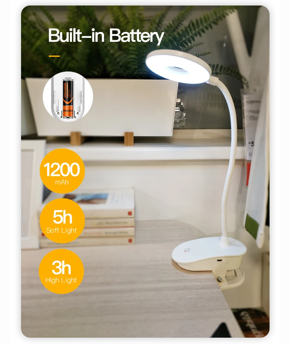 Настольная лампа Flexo, с клипсой, USB-кабелем и аккумулятором 18650