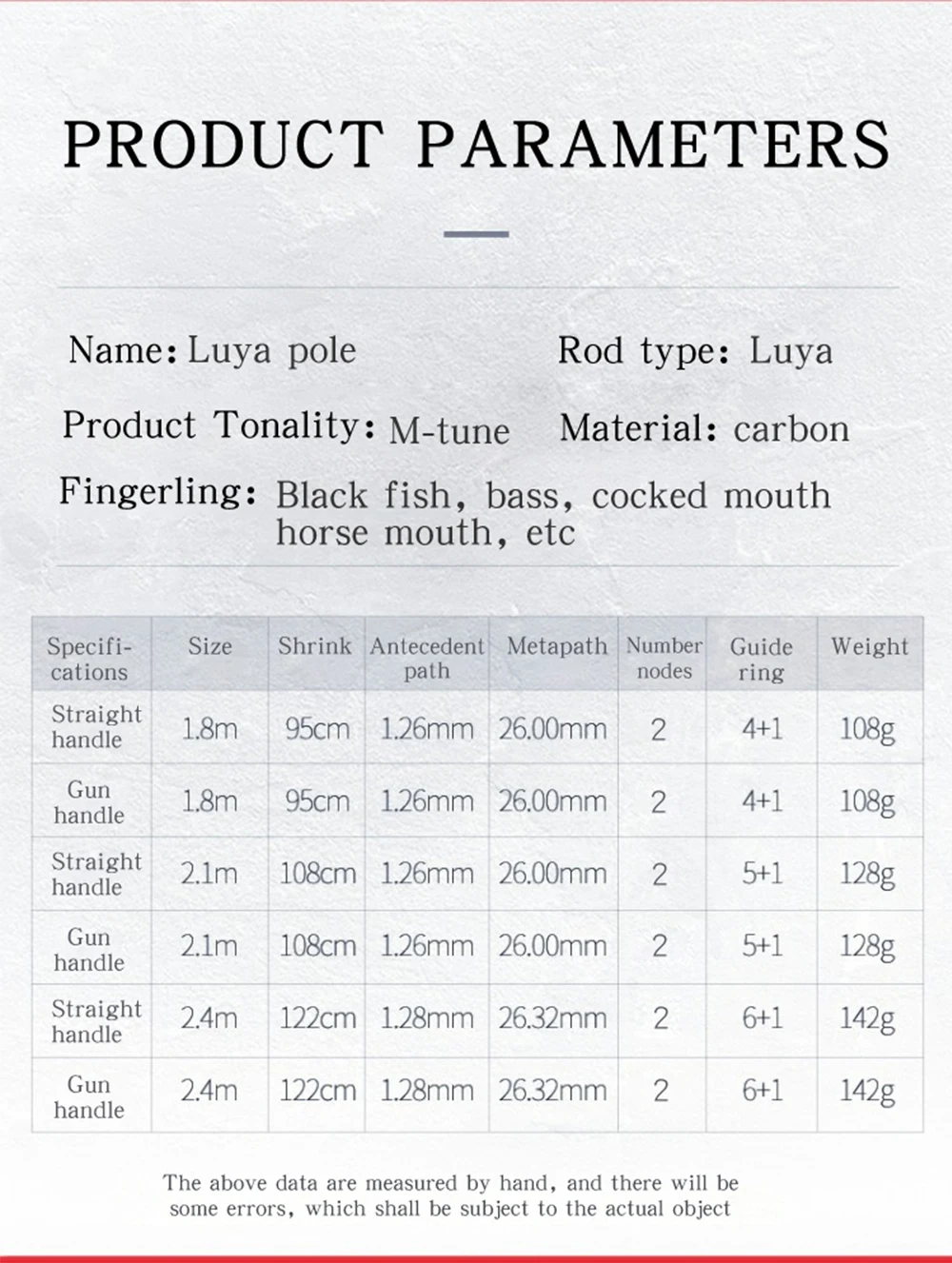 Примечание: ручное измерение. Допускается небольшая разница. Основная информация Тип удочки: телескопическая удочка Материал: углеродное волокно Тональность: м Цвет: черный Размер: 1,8/2,1/2,4 м Длина сжатия: 95 см 108 см 122 см Вес: 108 г 128 г 142 г Посылка в комплекте 1 шт. х Удочка (в комплект не входят держатель удочки и Рыболовная коробка. Они предназначены только для фотосъемки.)