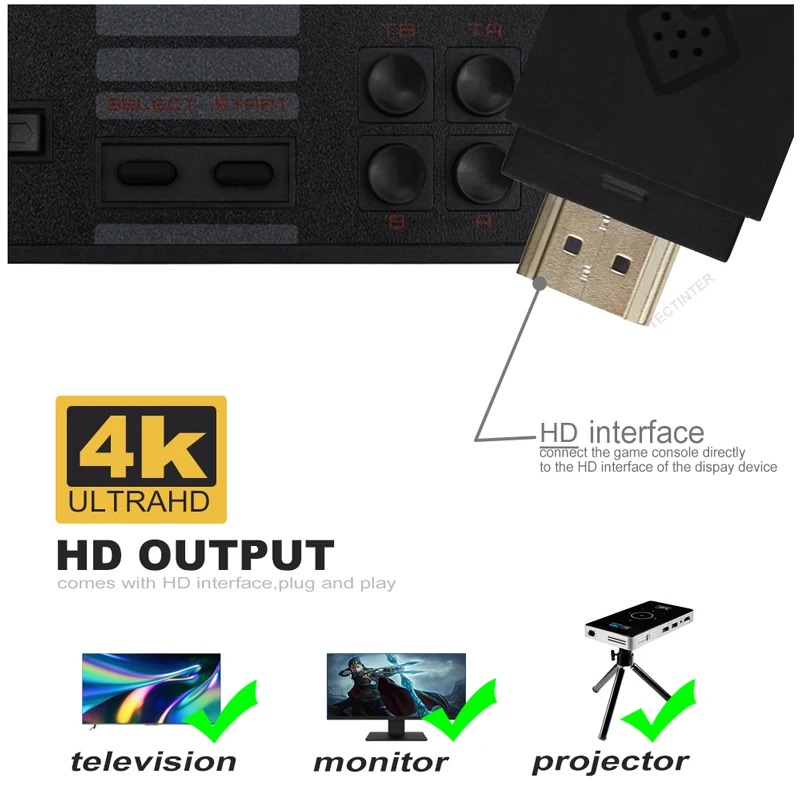 Игровая консоль первого поколения поддерживает только выход AV, и многие клиенты HDTV очень недовольны изображением! Постоянно делайте предложения для нас, чтобы изменить! Таким образом, мы обновили и оригинальной технологии, и теперь у нас есть официально черная 8-битный видео игровой консоли, который может поддерживать, совместимому с HDMI. Вы с нетерпением ждете этого? Наш контроллер видеоигр может воспроизводить беспроводные функции и поддерживать зарядку через USB в пределах 10 метров. Это решается из-за длины линии ручки, она должна быть близко к телевизору, в результате чего зрение теряется, вызванное продолжительным погружением в ожесточенную игру! Что еще более важно, только «1» (отмечен на геймпаде) он может поддерживать выход из игры, просто нажмите и удерживайте выбор + старт одновременно. Примечание: Эта ручка в настоящее время не поддерживает сохранение игры!