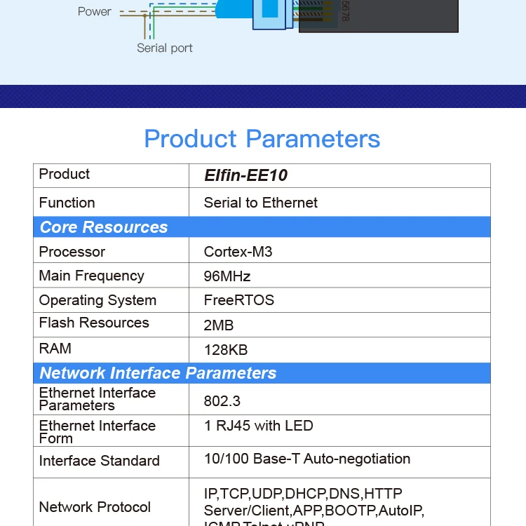 Серия Elfin-EE10A поддерживает RS232 в Ethernet, Elfin-EE10A блок является полным решением для последовательного порта устройства, подключаемого к сети. Это мощное устройство поддерживает надежную и проверенную операционную систему, хранящуюся во флэш-памяти, встроенный веб-сервер, полный стек протоколов TCP/IP и шифрование на основе стандартов (AES).