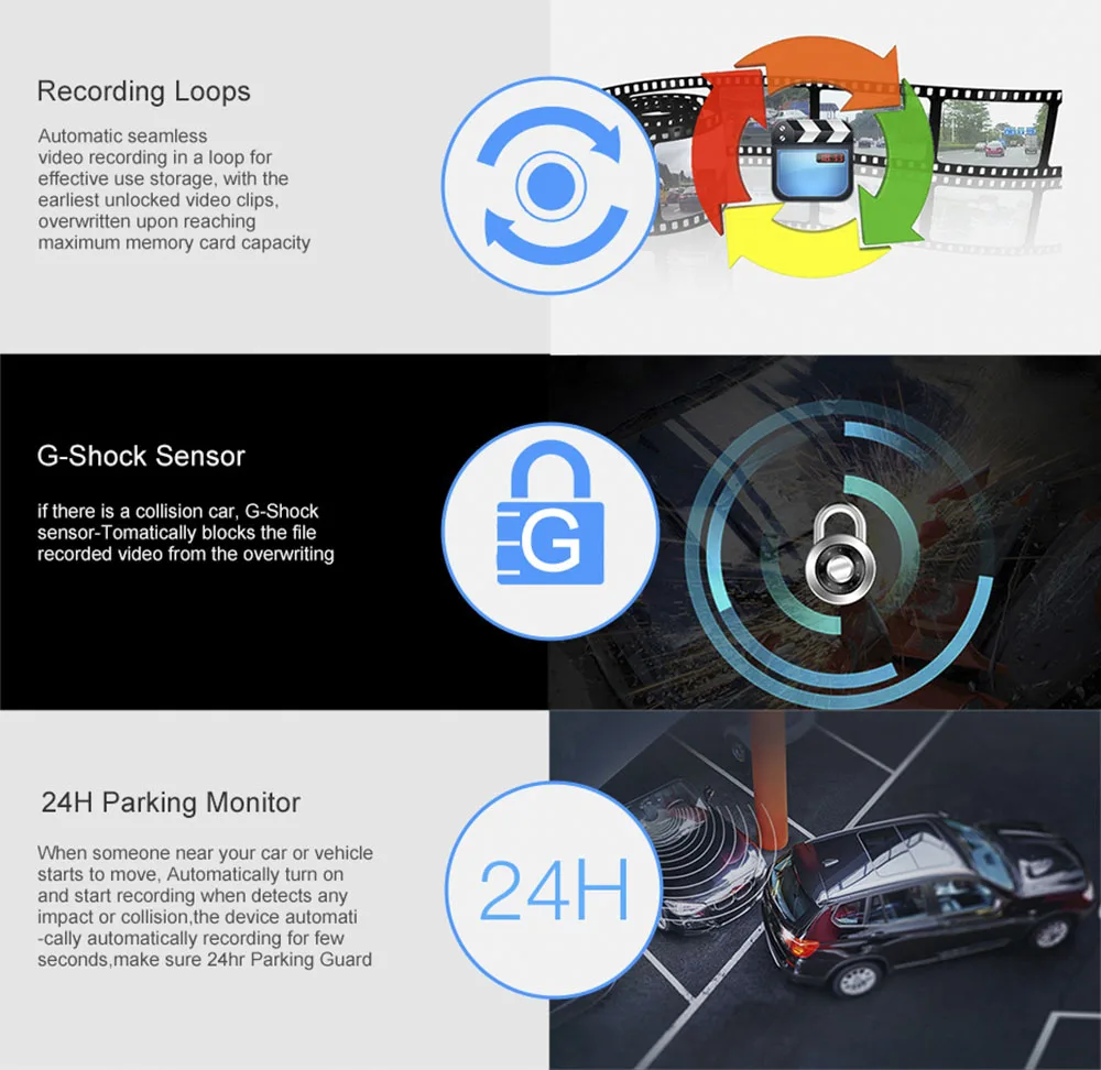 Когда кто-то рядом с вашим автомобилем или автомобилем начинает двигаться, автоматически включается и начинает запись при обнаружении любого удара или столкновения, устройство автоматически записывает в течение нескольких секунд, убедитесь, что 24hr парковочная защита. Посылки inlcude ODB buck line.