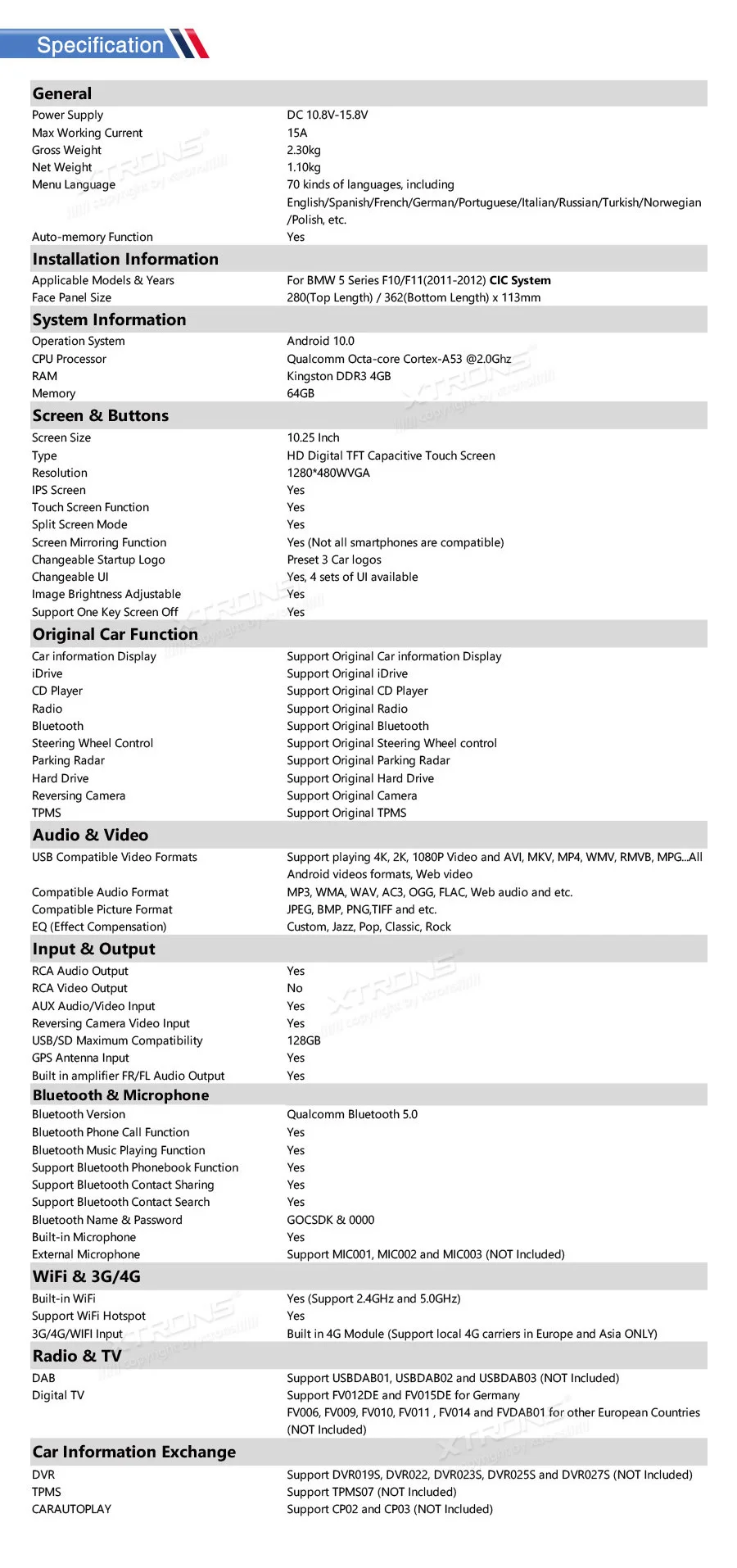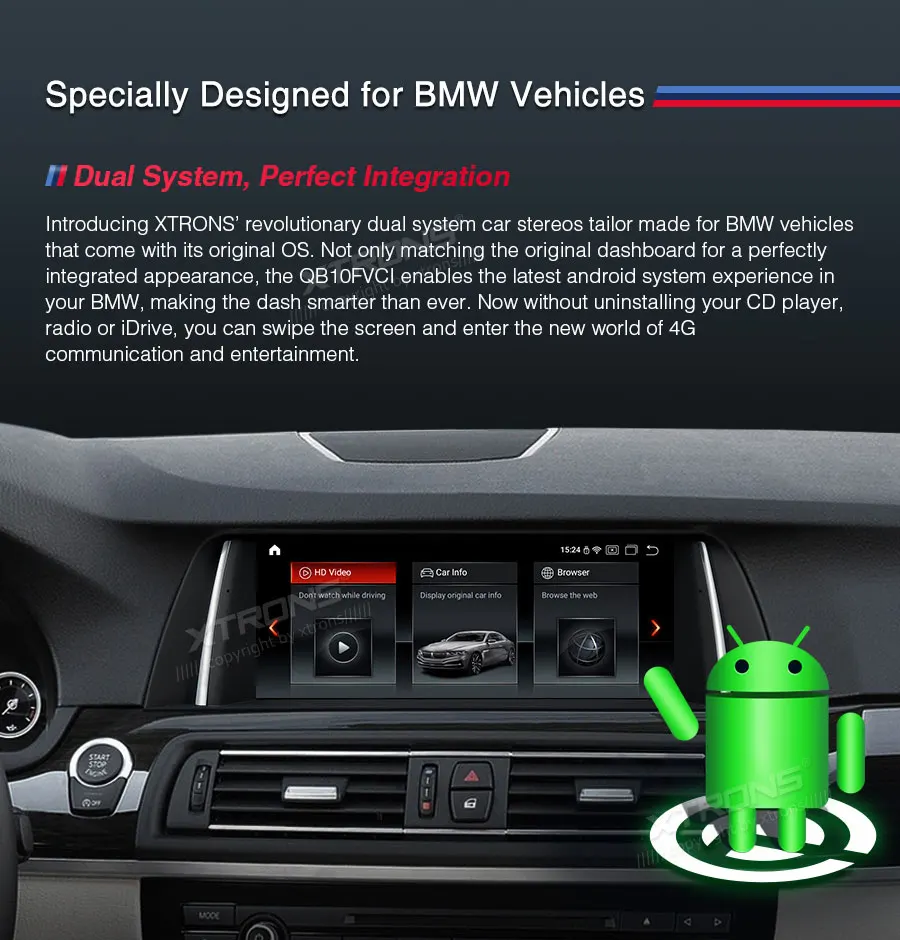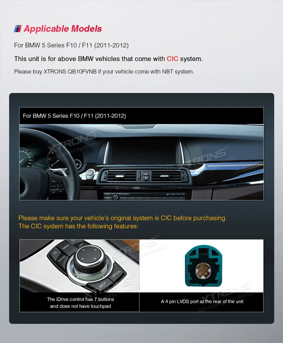 Применимые модели: Примечание: этот блок предназначен для автомобилей BMW, которые поставляются с CIC системой. Пожалуйста, посмотрите XTRONS QB10FVNB, если ваш автомобиль поставляется с системой NBT. Для BMW 5 Series F10 / F11 (2011-2012) Перед покупкой убедитесь, что оригинальная система вашего автомобиля CIC. Система CIC имеет следующие функции. Интерфейс BMW "Автомобильный информационный компьютер" Управление iDrive имеет 7 кнопок и не имеет сенсорной панели 4 контактный LVDS порт на задней панели устройства