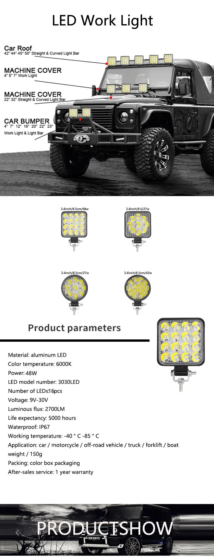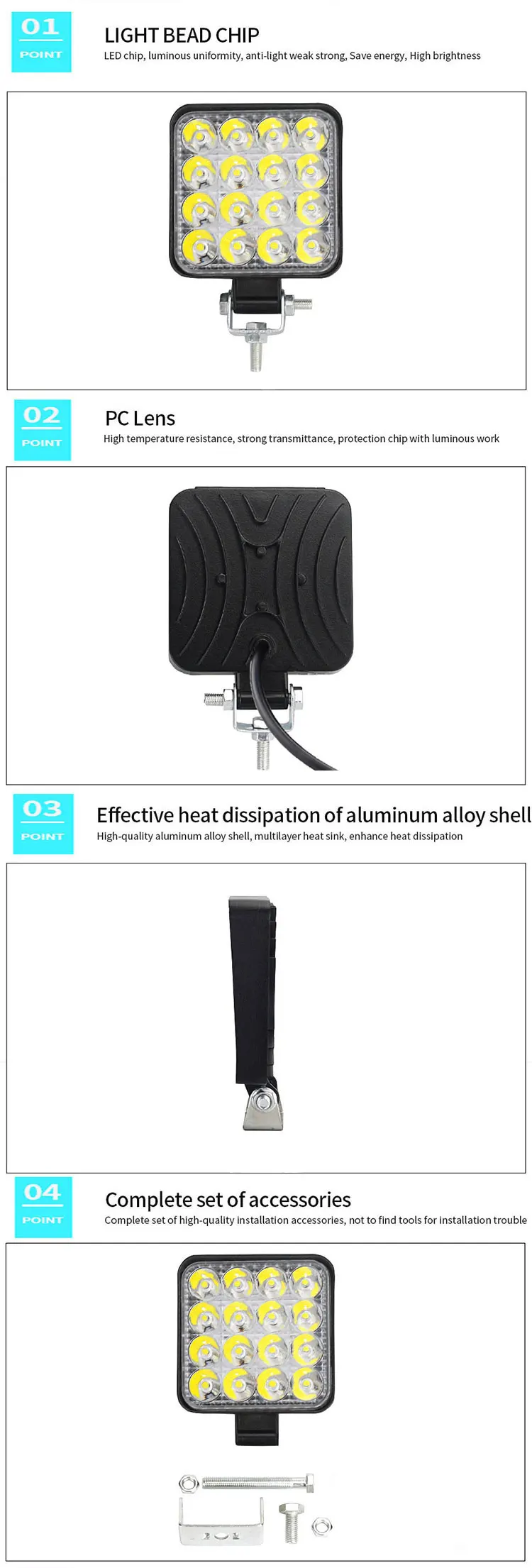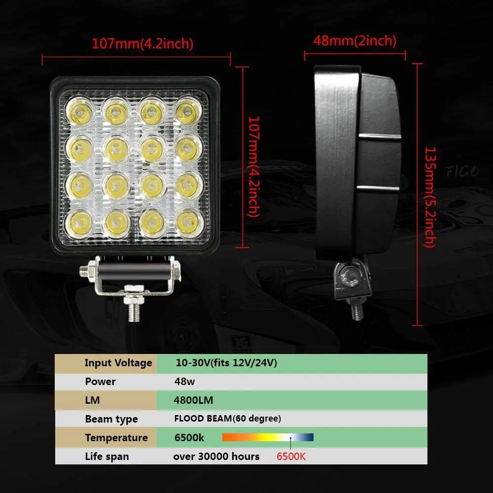 1. Высокая мощность потолочные светильник светодиодный рабочий светильник, 16x3 Вт высокой мощности и высокой интенсивности Белый светодиодный, цветовая температура 6000 K, 3520 лм. Прочная конструкция: черный окрашенный высококачественный алюминиевый корпус, регулируемый Монтажный кронштейн из нержавеющей стали и небьющиеся линзы, IP68 водонепроницаемый, прочный, выдерживает любые суровые условия. 2 в отличных погодных условиях, отличная водонепроницаемость, защита от пыли, ударов и коррозии. 3. Длительный срок службы: не вредит экологии дизайн с низким энергопотреблением, со встроенным модулем радиатор, длительный срок службы, Номинальное время 30000 часов. 4. Постоянный ток 10В-30В диапазон рабочего напряжения: подходит для всех типов грузовых автомобилей, внедорожных транспортных средств, 4x4 джип, внедорожник, горнодобывающей промышленности, морской, сельского хозяйства, а также тяжелой техники.