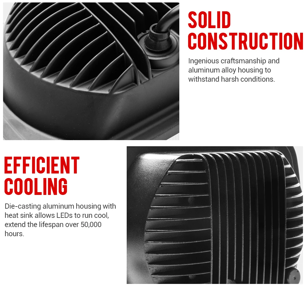 [Сверхмощная конструкция]-изготовлен из литого под давлением алюминиевого сплава корпуса и с высоким коэффициентом пропускания усиленного объектива PMMA, с водонепроницаемым классом IP67, он сверхпрочный и коррозионно-стойкий, изготовлен для длительного срока службы