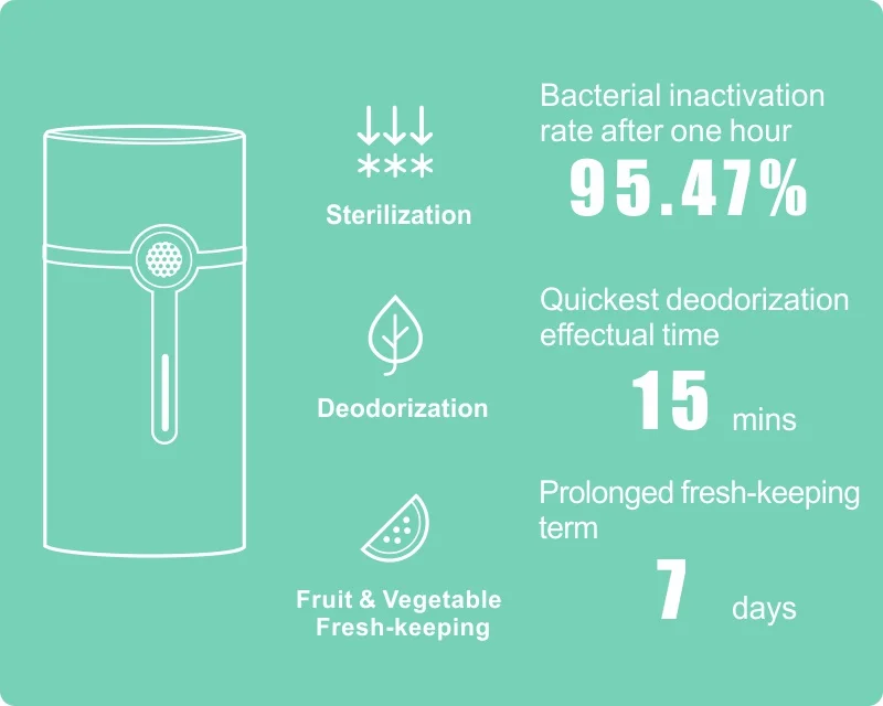 Между тем, это помогает сохранить продукты питания и овощи свежими дольше, ускоряя очистку остатков пестицидов. С концепцией здоровья и окружающей среды, этот стерилизующий дезодорант разработан умным и многофункциональным.