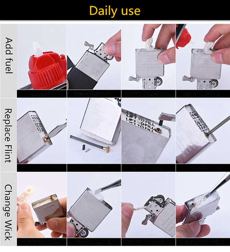 Если вы купили 2 шт. и больше, вы получите дополнительную скидку 2%. Если вы заказываете в моем магазине, мы отправим вам специальный подарок в вашей посылка. Из-за газа нельзя садиться на самолет, поэтому зажигалка, которую мы отправляем без газа, Вы должны добавить газ самостоятельно. Заказ будет отправлен случайными цветами по умолчанию. Если у вас есть какие-либо требования, пожалуйста, оставьте сообщение и сообщите мне цвет, который вам нужен. Цвет: Золотой/черный -Материал: металл -Заполните Тип топлива: керосин -Защита от ветра: Да -С защитой от ветра, в ретро-стиле