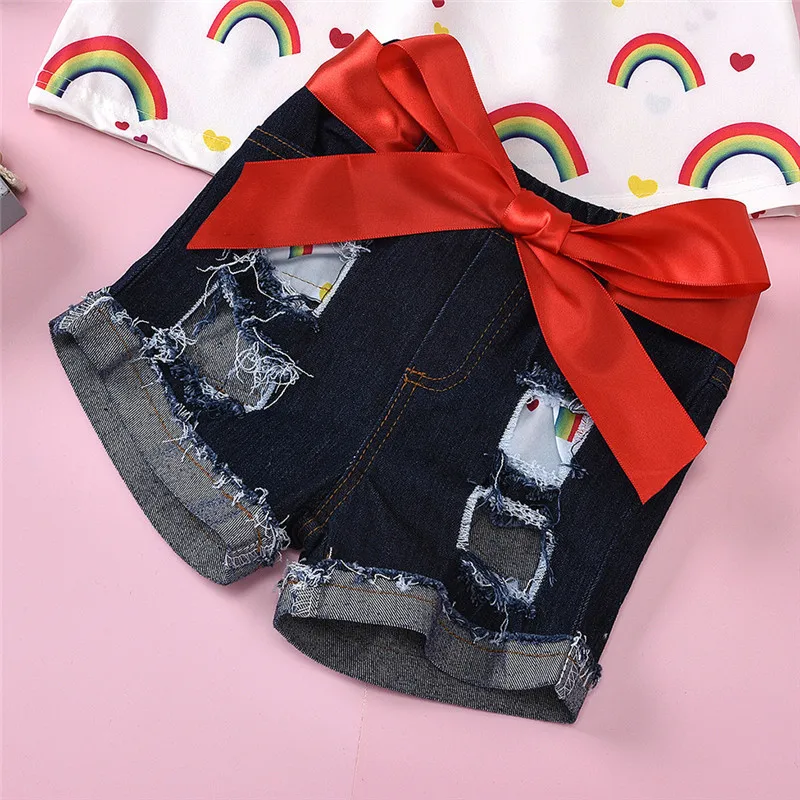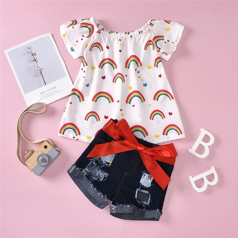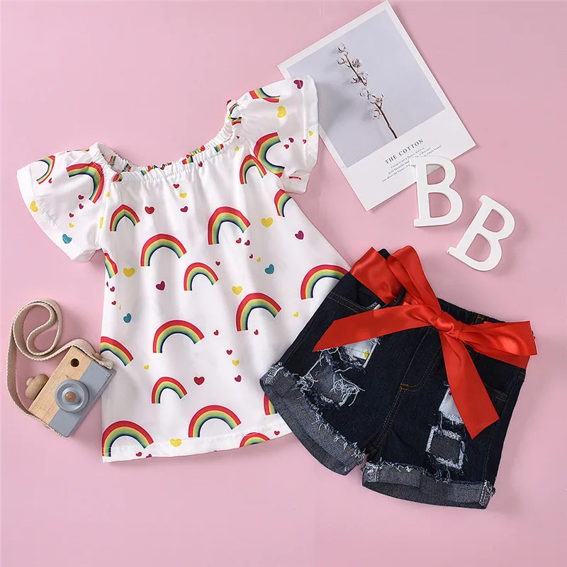 Одежда для новорожденных девочек из 2 предметов топы с открытыми плечами для малышей, джинсовые шорты с бантом одежда для малышей Милая летняя одежда комплект для малышей