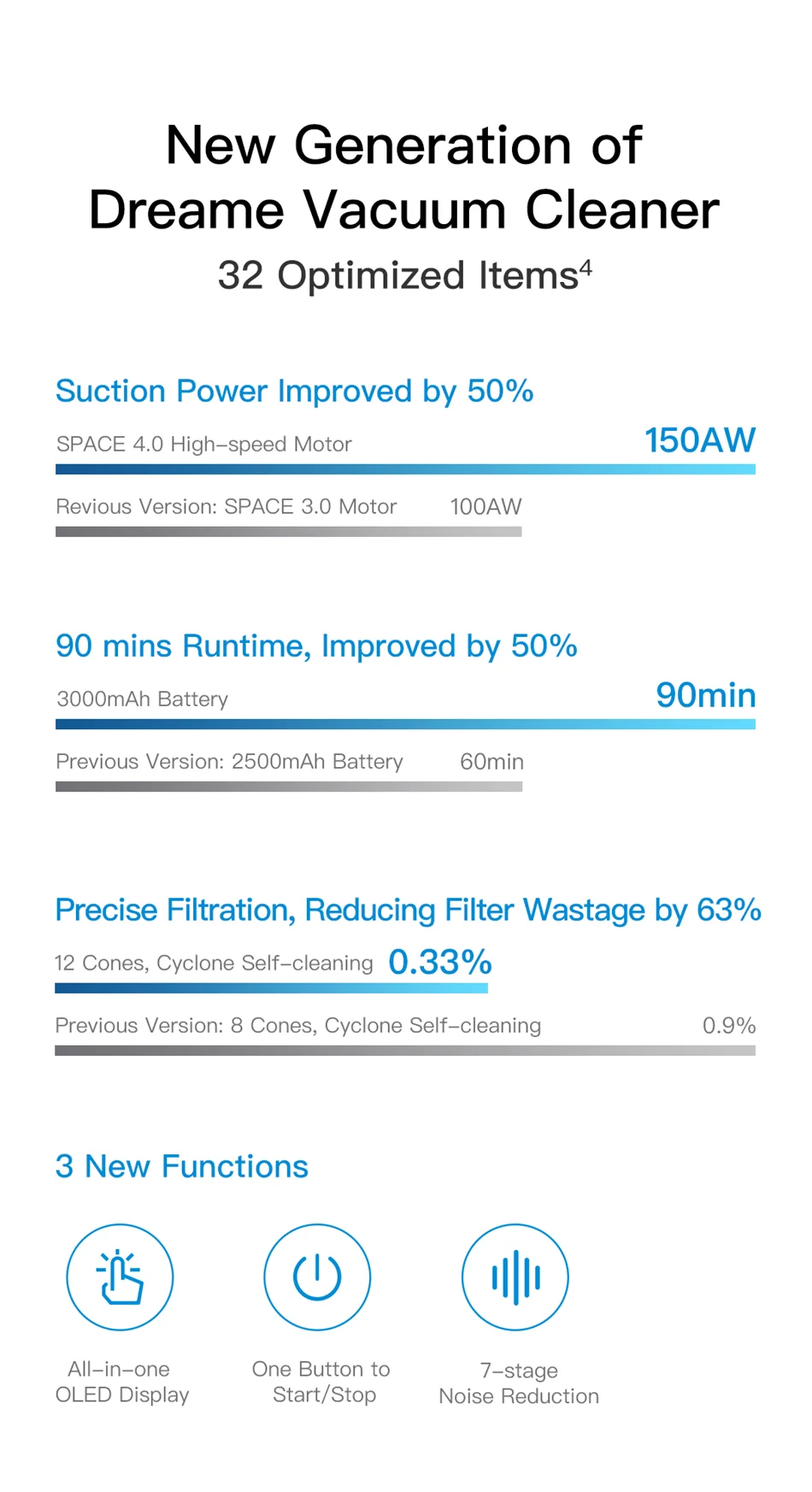 32 оптимизированных элемента мощность всасывания улучшена на 50% 90 минут во время работы. Улучшенная на 50% точная фильтрация, уменьшение потерь фильтра на 63% 3 новых функций