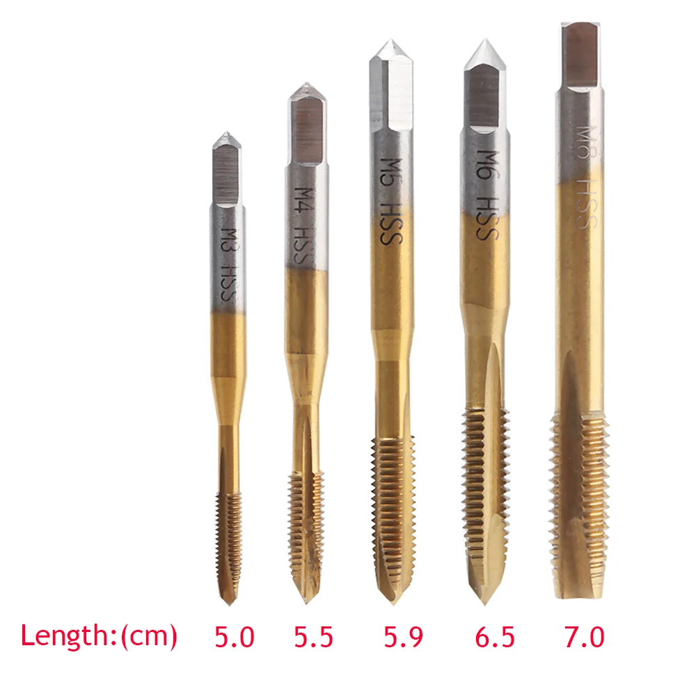 Type: Screw Tap Straight Flute Tips Material: HSS Type: M3/M4/M5/M6/M8 Spiral pointed tap for threading a circular tube,down rows of pins Spiral pointed tap also called POT Titanium surface of the product,so it's call higher accuracy,and more durable Suitable for processing of stainless steel and ordinary steel