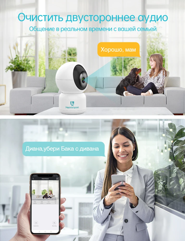 Heimvision Wi-Fi камера поддерживает ночное видение радиус действия до49 фт/15 м, а также обеспечивает впечатляющую четкость ночного видения за чет ИК светодиодого светильника, который может работать так же, как сдерживающим фактором против кражи, преднамеренного повреждения, вандализм. Камера для домашних животных оснащена усовершенствованным встроенным антишумовым микрофоном и динамиками, вы можете легко разговарить с вашим ребенком/старшим/домашним животным и контролировать их в любом месте и в любое время.