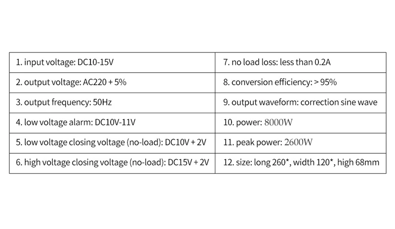 1. Пожалуйста, оставьте нам сообщение о том, какой тип вам нужен, от 12 В до 110 В, от 24 В до 110 В, от 12 В до 220 В или от 24 В до 220 В. 2. Только 8000 Вт имеет ЖК-дисплей!