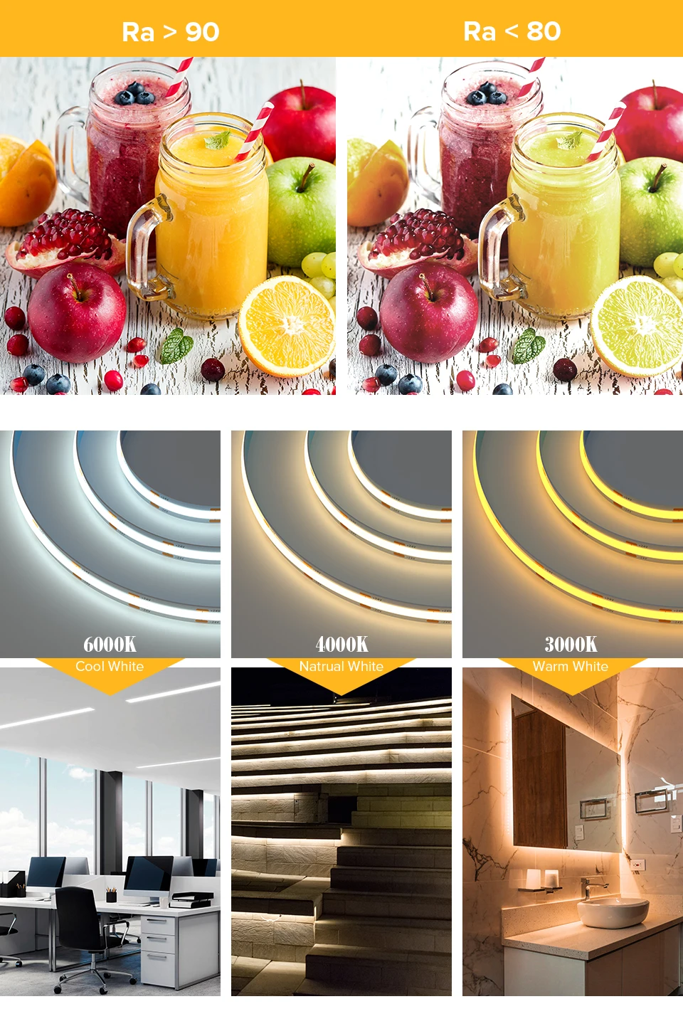 Цветовая температура: теплый белый (3000K), натуральный белый (4000K), холодный белый (6000K).
