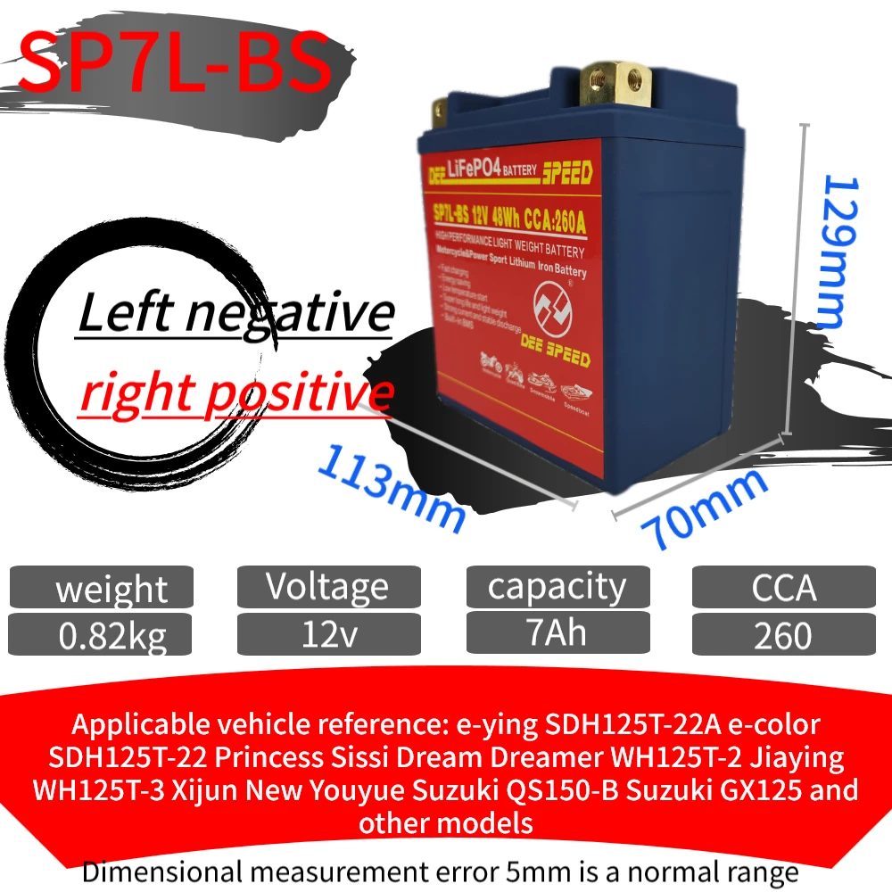 Номер модели: SP4L-BS SP5L-BS SP7S Емкость: 4Ah 5Ah 7Ah CCA: 160A 180A 260A Максимальное напряжение защиты: 14,6 в Конечное напряжение: 8 в Размер: SP4L-BS 113*70*85 мм SP5L-BS 113*70*105 мм SP7L-BS 113*70*130 мм SP7S 113*70*105 мм Сертификат: CE ROHS MSDS UN38.3 Обновленные детали/аксессуары: класс А Плата защиты напряжения: Да Срок службы: более 2000 раз Максимальный ток зарядки: 10A Подходит для: Little Monkey JOG Magnolia AG50 Little Sand 90 Big Louis 90 и т. Д. Направление положительного и отрицательного электрода: L отрицательное положительное оставлено отрицательное и правое положительное, L положительное отрицательное оставлено положительное и правое отрицательное Примечания к покупке 1. Пожалуйста, сообщите нам, какой бренд и модель вашего мотоцикла, мы порекомендуем подходящие модели для вас. 2. Перед установкой и использованием убедитесь, что вся электрическая система мотоцикла является нормальной (Е. g. Выпрямитель, Магнето и есть ли утечка электричества) и избегайте доставки в оба конца, вызванной возвратом товаров, кроме батареи, перед проблемами качества. 3. Пожалуйста, проверьте положительное и отрицательное направление оригинальной батареи перед покупкой, чтобы избежать ситуации, которая не может быть установлена после покупки. 4. Стандарты измерения свинцово-кислотных батарей и батарей lifepo4 отличаются, можно рассматривать как количество liftpo4, разделенное на два, что эквивалентно емкости свинцово-кислотных батарей. (Например, 4.5AH для батареи lifepo4 эквивалентен 9AH для свинцово-кислотной батареи, но пусковой ток такой же, как для свинцово-кислотных 9AH). 5. Если мотоцикл оснащен другими электрическими приборами, потребление электроэнергии будет зависеть, особенно GPS и сигнализация, что значительно повлияет на состояние ожидания литиевой батареи.
