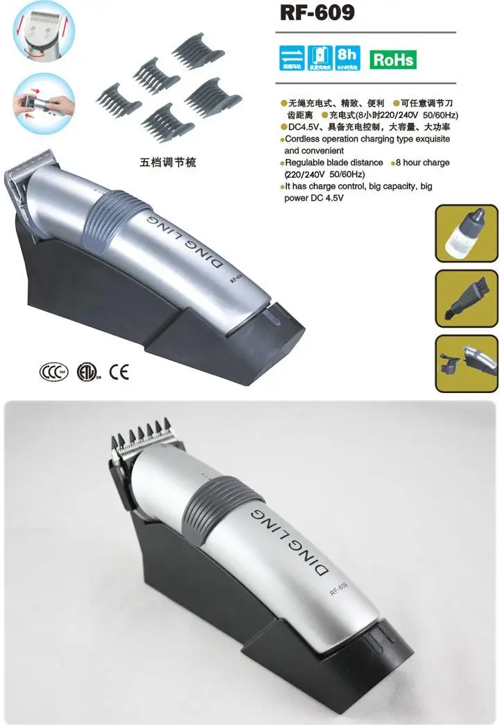 Бренд: DingLing Номер модели: RF-609 Цвет: серебристый Входное напряжение адаптера: 220-240 В ~ 50/60 Гц Выходное напряжение продукта: 5,5 В --- 150 мА Время зарядки: 8 часов Размер: 17*4,1*3,1 см Мощность: 4 Вт Тип вилки: штепсельная вилка европейского стандарта
