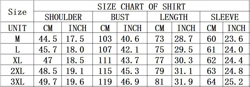 РазмерТаблица размеровРубашкаПлечоБюстДлинаРукавБлокСмДюймСмДюймСмДюймCМДюймМ44,517,510340,67328,76023,6L45,718,010742,17529,56124,0XL4718,511143,77730,36224,42XL48,519,111545,37931,16324,83XL49,719,611946,98131,96425,2