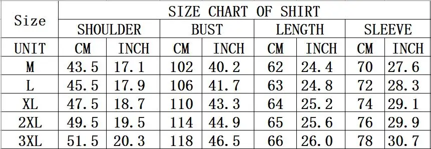 РазмерТаблица размеров рубашки ПлечоБюстДлинаРукавБлокСмДюймСмДюймСмДюймCМДюймМ43,517,110240,26224,47027,6L45,517,910641,76324,87228,3XL47,518,711043,36425,27429,12XL49,519,511444,96525,67629,93XL51,520,311846,56626,07830,7