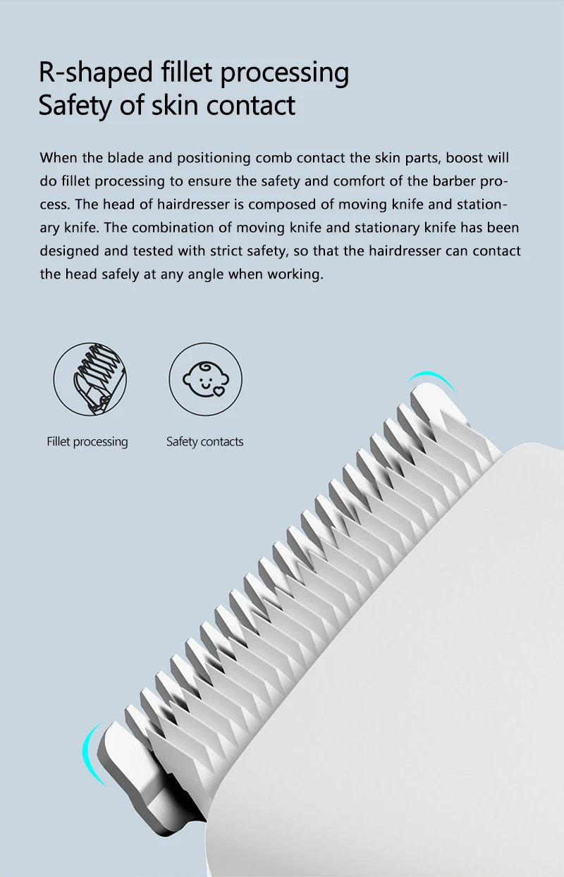 Когда лезвие и расческа для позиционирования свяжутся с деталями кожи, boost сделает обработку филе, чтобы обеспечить безопасность и комфорт парикмахерской pro cess. Головка парикмахера состоит из подвижных ножей и ножей для установки. Комбинация подвижного ножа и стационарного ножа была разработана и протестирована с строгой безопасностью, так что парикмахер может безопасно связаться с головой под любым углом при работе