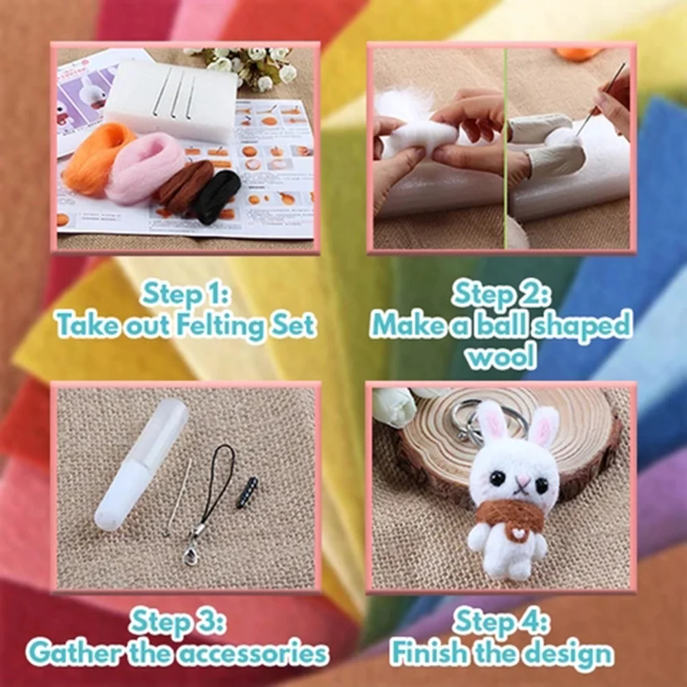 3. Это высококачественная Натуральная шерсть, очень безопасная и долговечная. Он состоит из поролоновой подкладки, глаза пуговки, висячей веревки, шерстяных фетровых материалов, деревянной ручки и иглы для валяния и всего, что вам нужно.