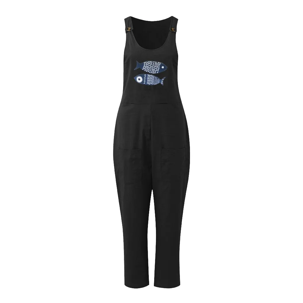 Женский Повседневный комбинезон в стиле бохо с принтом рыбы, с карманами, длинный комбинезон на бретелях, комбинезон с пуговицами