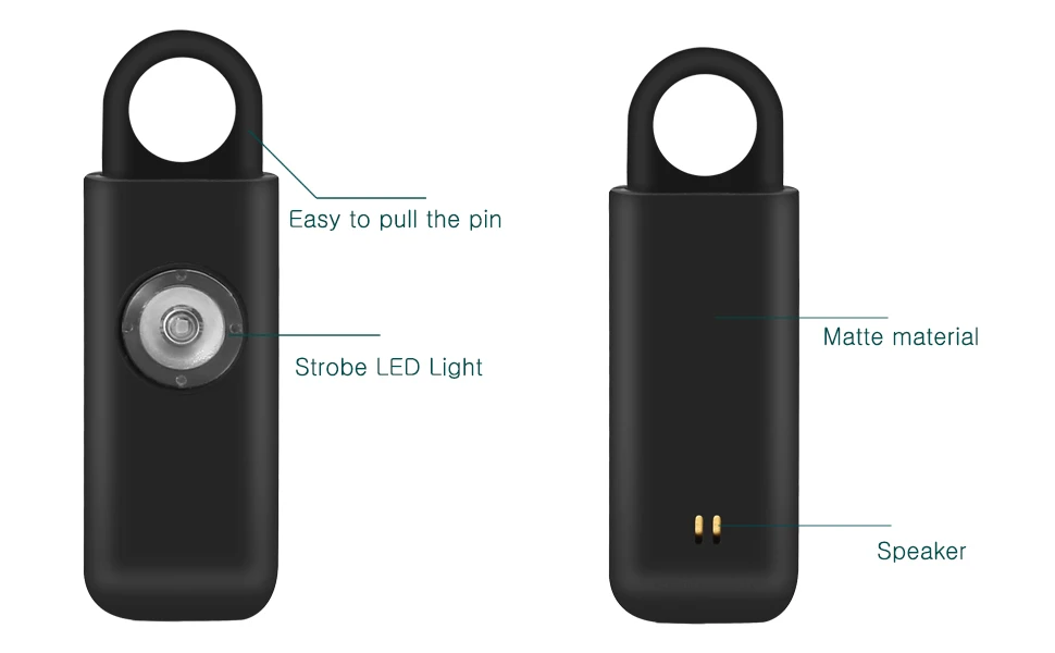 【Легко использовать/Carry】 поставляется с крючком, чтобы легко прикрепить сигнализацию к сумкам, ремням, курткам, брелкам и т. д. просто потяните штырь и громкий звук 130 дБ и мигающий стробоскопический светильник услышит вас.