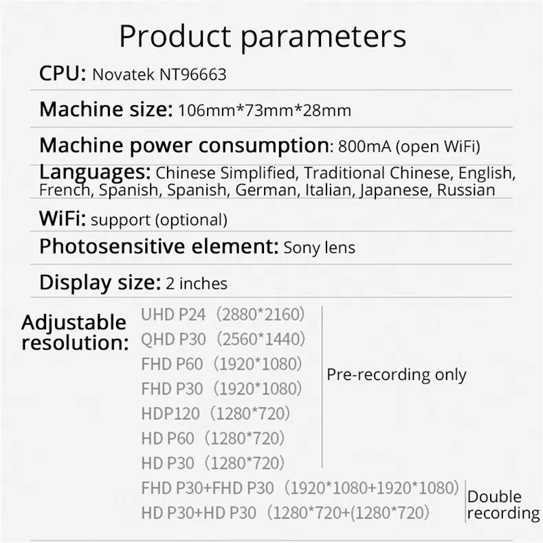 Внешний размер: 106*73*28 (мм) Карта памяти: TF карта Угол съемки: 170 ° Пиксели: 12 миллионов Вес: 350 (г) Емкость хранения данных: максимальная поддержка 256G Время хранения данных: около 40 часов Интерфейс передачи данных: USB, HDMI Скорость передачи: 30 м/с Мощность питания: 12V-5V Напряжение: 12 В Номинальный ток: 1.5A