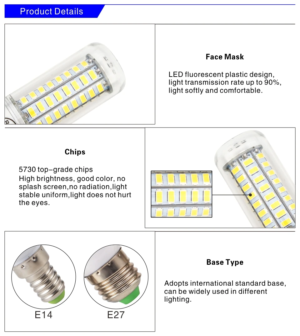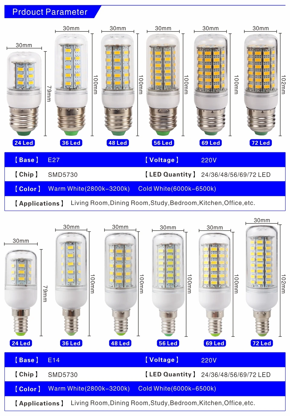 Светодиодный Количество: 24/36/48/56/69/72 светодиодный s Тип цоколя: E27/E14 Напряжение: AC220V-240V Светодиодный Тип: SMD5730 Угол луча: 360 ° Световой поток: 300-850LM Цвет Температура: Теплый белый: 2800-3200K Холодный белый: 6000-6500K Срок службы: более 50000 часов
