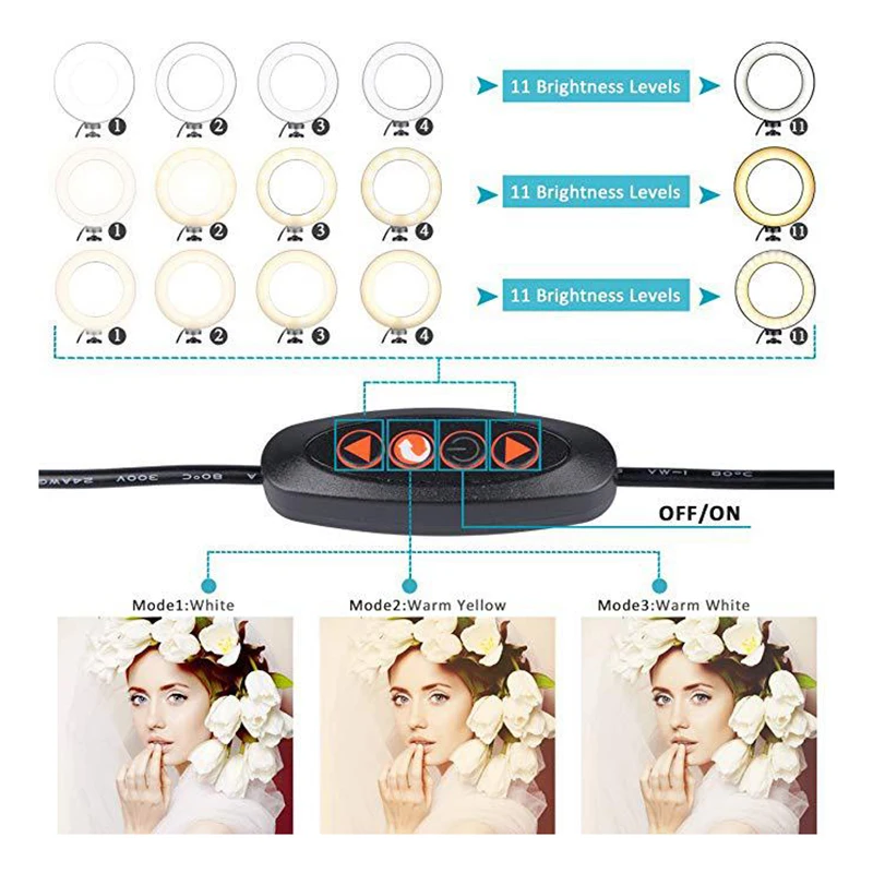 • 5,7-дюймовый кольцевой светильник, светодиодный светильник дизайн, 11 регулируемые настройки яркости экрана, чтобы удовлетворить все ваши потребности в различных условиях. 3 Виды светильник режима: белый, теплый желтый, теплый желтый + белый. Он пригодится, когда вам нужен дополнительный светильник, чтобы делать снимки, делать фотографии, делать видео, читать книги и транслировать в прямом эфире!