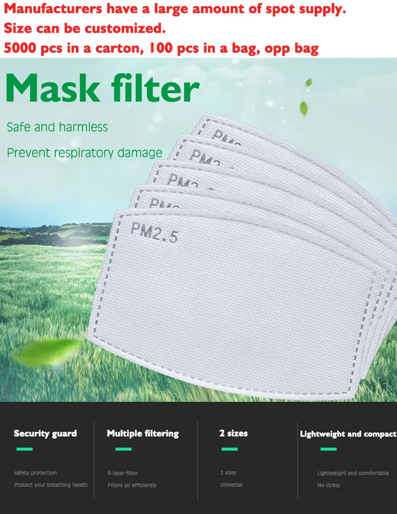 О товаре: 1. Материал: ПП антиприклеиваемая ткань + мелтдувная ткань + ткань из активированного углерода 2. Использование: анти-запах, Анти-пыль, анти-газ, антибактериальный, anti-PM2.5 аллергии, дыма, загрязнения, золы, пыльцы; 3. Область применения: маски для пыли, маски для самостоятельного использования, салоны красоты, маски для зоомагазинов, Заводские маски, маски для пищевой промышленности, маски для очистки окружающей среды и другие защитные пыли. 4. Фильтр маски обеспечивает комфортную защиту для людей. Рекомендуется заменять флитеры каждую неделю использования для лучшего эффекта. 5. Подходит для типа масок PM2.5 для лица для типа масок PM2.5. Функция фильтра: 1. Первый слой: ткань спанбонд, фильтр пыли микрон 2. Второй слой: для фильтрации промышленных загрязняющих веществ, автомобильных выхлопных газов, вторичного дыма пыльцы аллергии 3. Третий слой: ткань из активированного углерода, бензол и меньшая функция фильтрации микрон пыли 4. Четвертый слой: плотность фильтра, меньший материал 5. Пятый слой: ткань спанбонда, фильтрует все виды вредных веществ; 6. Применение: больницы, выход, сайт, туризм, простуда, рабочие мастерские, фермы, Дымчатая погода, холодная и теплая Пожалуйста, обратите внимание, что указанный Товар производится и распространяется за рубежом и в соответствии с законодательством страны его происхождения Советы: 1. Вставной фильтр не может быть очищен, рекомендуется 1-2 дня для замены a; 2, фильтрующее масло на пленке или с липкими пятнами осадка больше, пожалуйста, замените фильтр 3, воздух не гладкий, дыхание трудно или сон, носить не рекомендуется 4, 2 недели следующая емкость легкого ребенка низкая, не рекомендуется Размер: Aduit 12*8 см Простая полипропиленовая упаковка Пожалуйста, обратите внимание, что указанный Товар производится и распространяется за рубежом и в соответствии с законодательством страны его происхождения