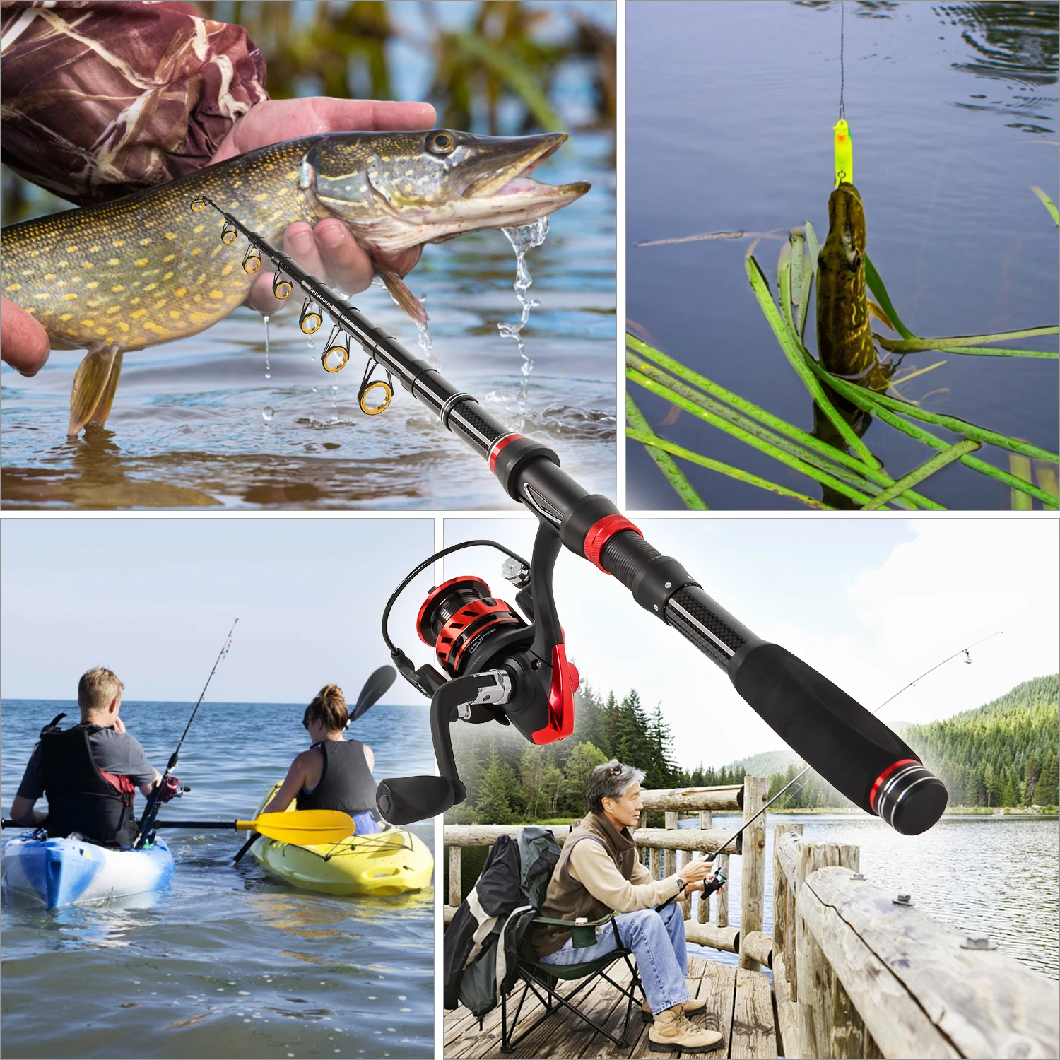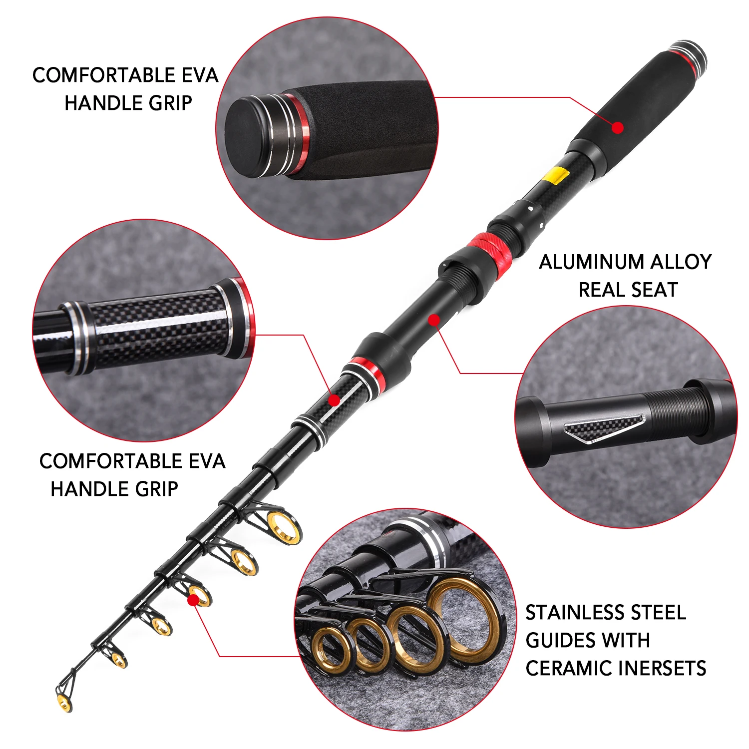 Телескопическая удочка: изготовлена из углеродного волокна высокой плотности, Удочка легкая и прочная. Он Телескопический и Закрытая длина делает его очень удобным для переноски.