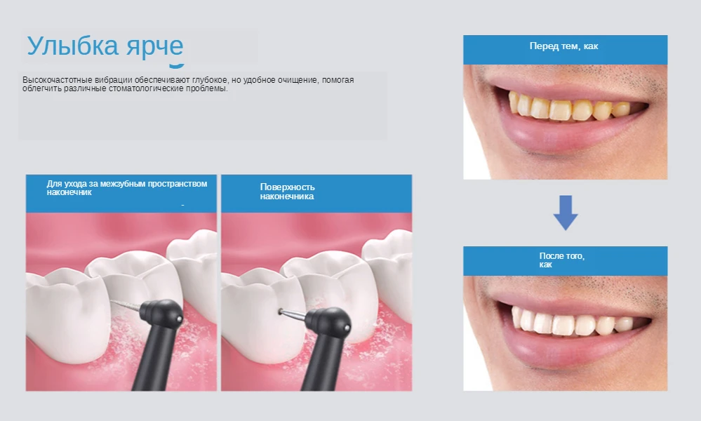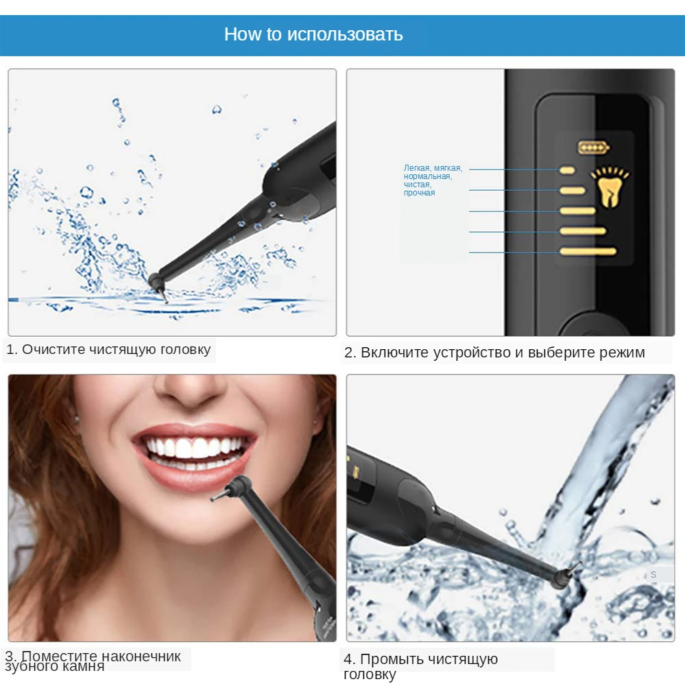 Устройство для удаления зубного камня имеет до 30000 вибраций в минуту и изготовлено из высококачественной нержавеющей стали, которая будет тщательно работать для удаления зубного налета, зубного камня и пищевых отходов на рту.