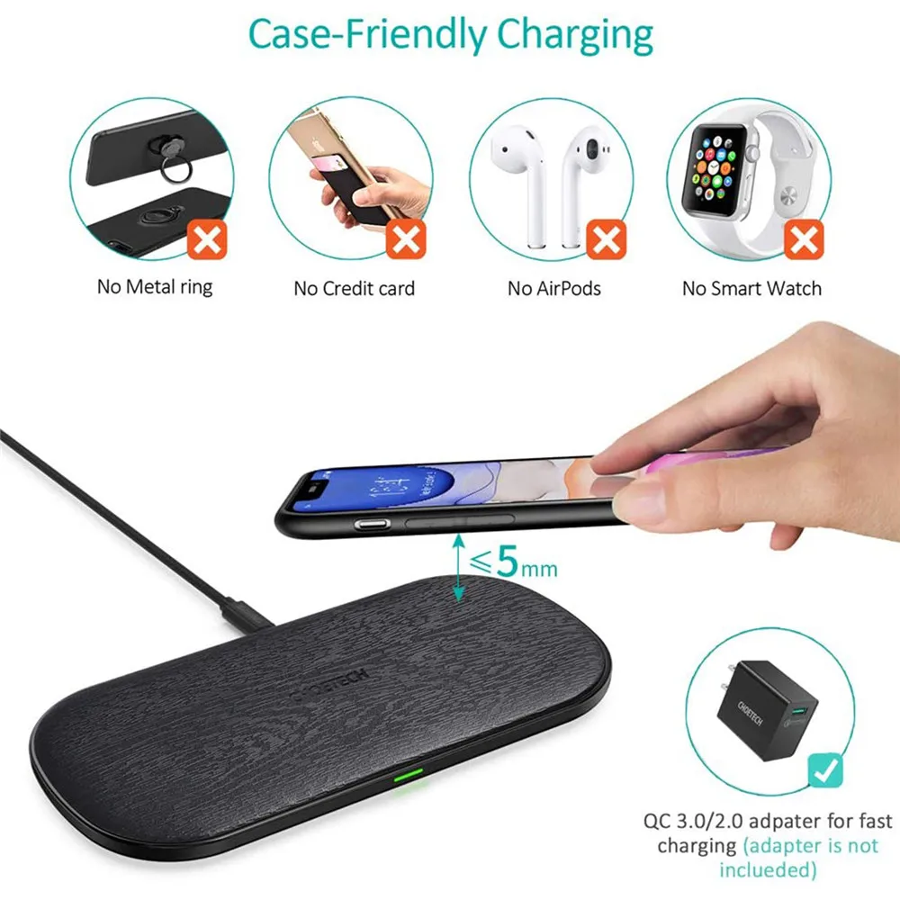 Это Беспроводное Зарядное Устройство оснащено двумя зарядными ковриками, совместимыми с Qi, имеющими возможность одновременной зарядки двух телефонов на выходе до 18 Вт. Беспроводная зарядная панель со встроенными 5 катушками обеспечивает более широкую зону зарядки для повышения эффективности зарядки. Нужен адаптер QC 3,0 (не входит в комплект)
