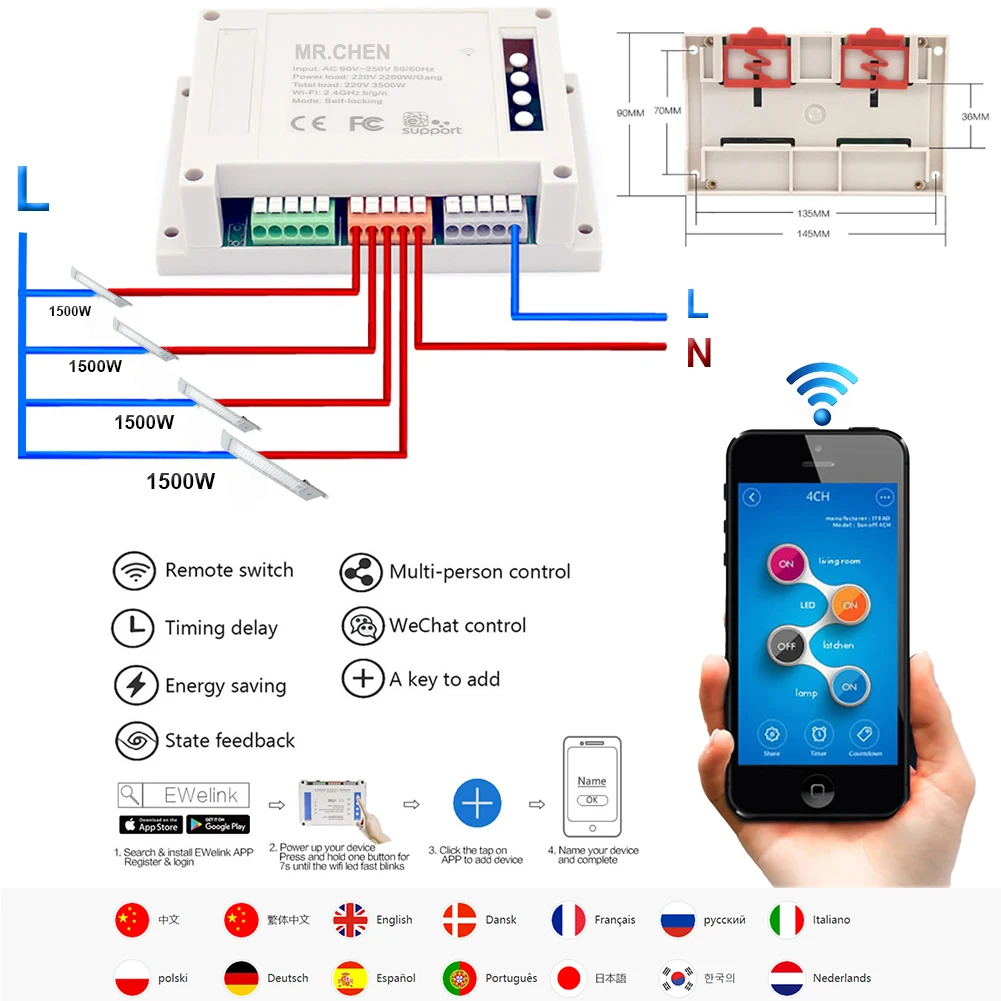 > MR.CHEN Smart APP Wifi Switch; > Поддерживает сеть WiFi; > Бесплатные IOS и Android mobile; > Управляйте каждой бандой отдельно; > Управляйте своим умным домом вместе с семьей; > Поддерживает Статус устройства в режиме реального времени, предоставленный в приложении; > Поддерживает включение/выключение электрических устройств из любого места; > Таймеры по расписанию/обратному отсчету для включения/выключения в указанное время; > Поддерживает 8 таймеров по расписанию/обратному отсчету/циклу для каждого устройства; > Поддерживает множество смарт-переключателей WiFi на одном смартфоне (вам нужно только добавить устройства в приложение); > Работает с голосовой Amazon Alexa,Echo, Echo Dot, Amazon Tap; > Работает с голосовым Google Assistan/Home/Nest; > Работает с IFTTT. > И т. д...