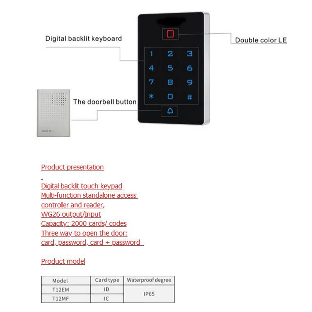 Презентация продукта Цифровой дисплей подсветкой сенсорная клавиатура Многофункциональный автономный доступ Контроллер и устройство для чтения, WG26 выход/Вход Емкость: 2000 карт/кодов Три способа открыть дверь: Карта, пароль, карта + пароль