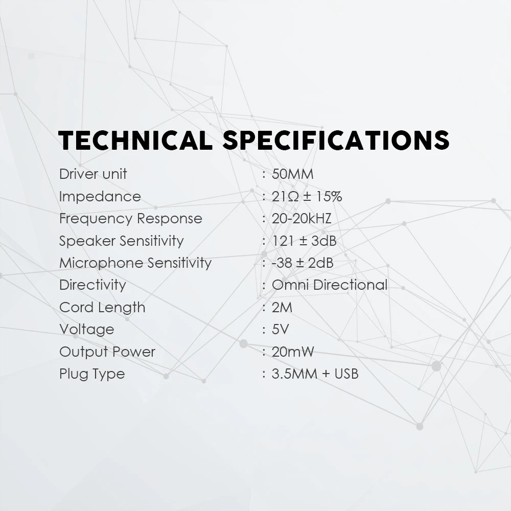 Тип штекера: 3,5 мм + USB Длина кабеля: 2 м Пластиковый кабель Вес: 337 г Диапазон Freq: 20-20K Гц Чувствительность динамика: 121 +/-3 дБ Чувствительность микрофона:-38 +/-2 дБ Сопротивление: 21 +/-15% Светодиодный: разноцветный "Красный-зелёный-желтый свет