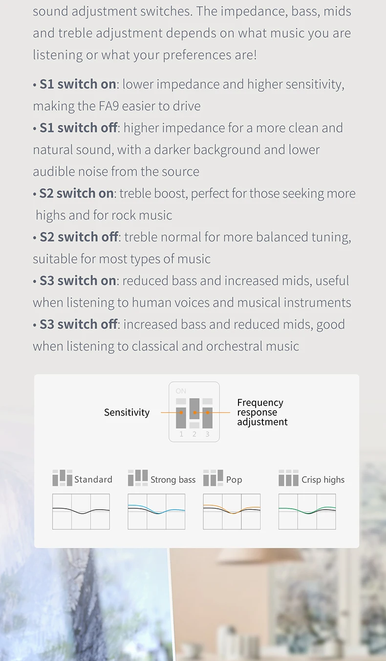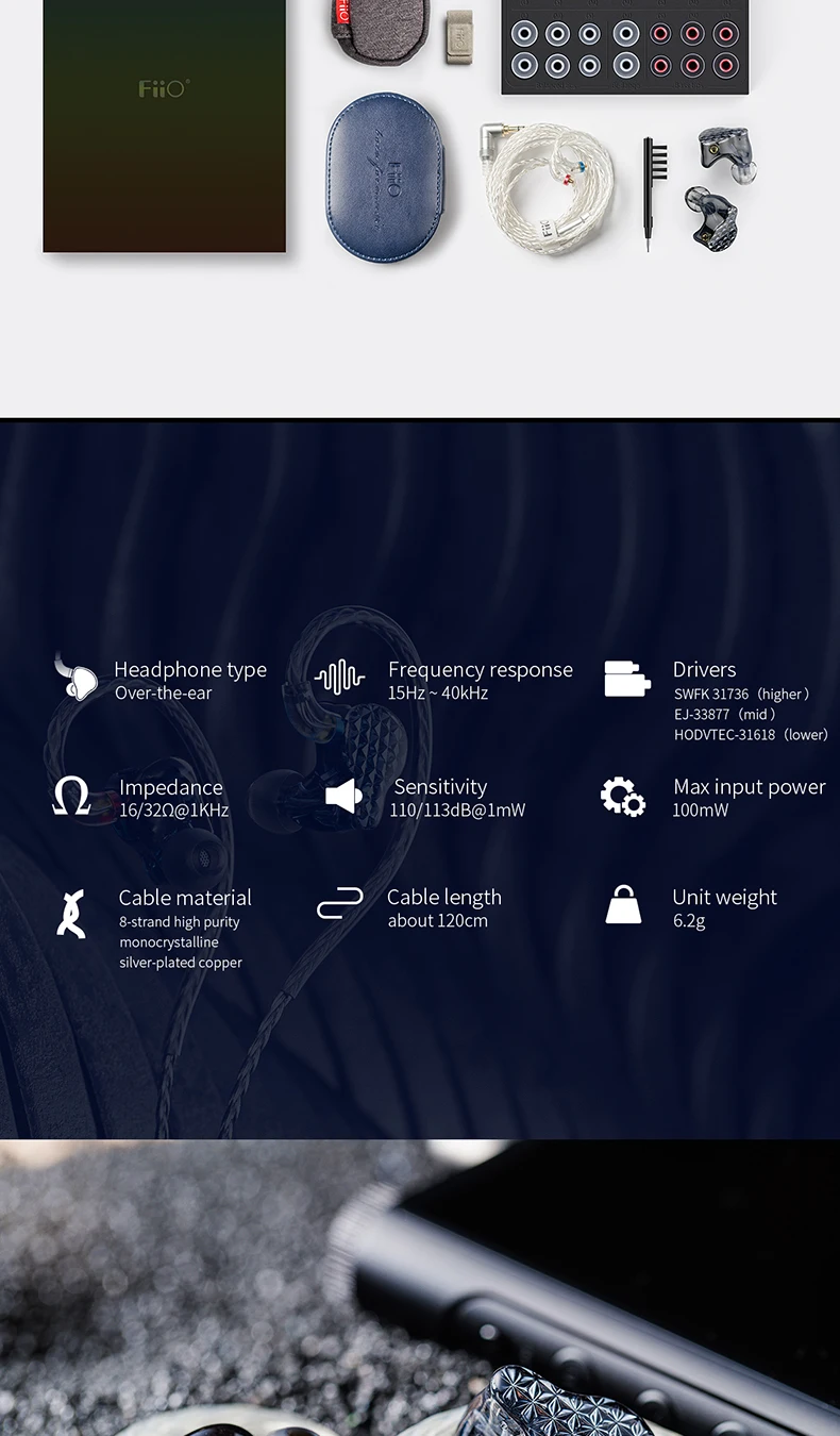 Характеристика: 6 Ноулз Ба | DLP 3D печать Сверхдлинная звуковая трубка 80,6 мм 4-полосная электронный кроссовер 3 выключателя регулировки звука 8-нить монокристаллический посеребренный медный кабель Параметр: Драйверы: SWFK-31736 (более высокие частоты) EJ-33877 (средние частоты) HODVTEC-31618 (нижние частоты) Кабельных разъемов: 3,5 мм для наушников, просечно-вытяжной MMCX инструменты для наращивания волос Чувствительность: 110/113dB @ 1 мВт Длина кабеля: 120 см Частотная характеристика: 15 Гц ~ 40 кГц Сопротивление: 16 ~ 32 Ω @ 1 кГц Тип наушников: над ухом Вес: около 6,2 г Максимальная входная мощность: 100 мВт