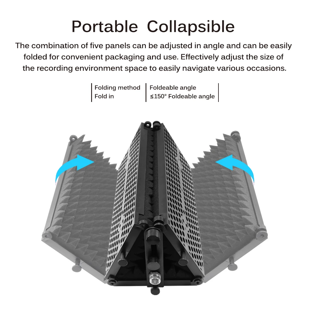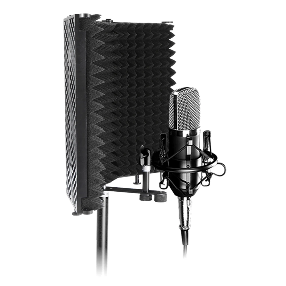 The inner side of the microphone isolation shield is made of absorbing foam insulation that can reduce sound reflection when recording.