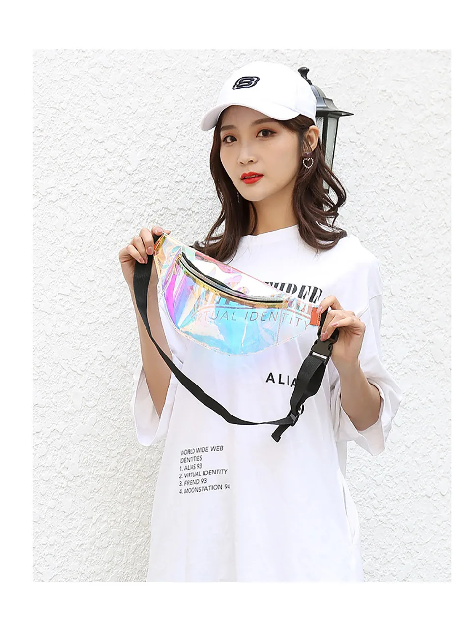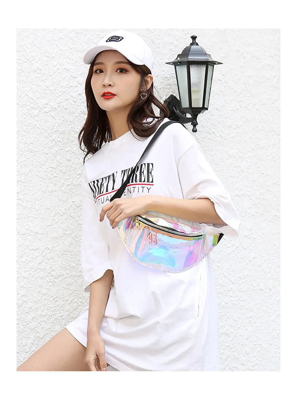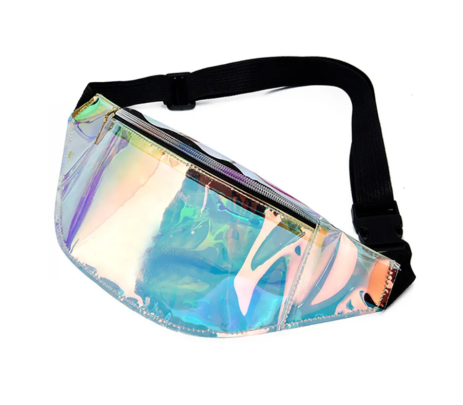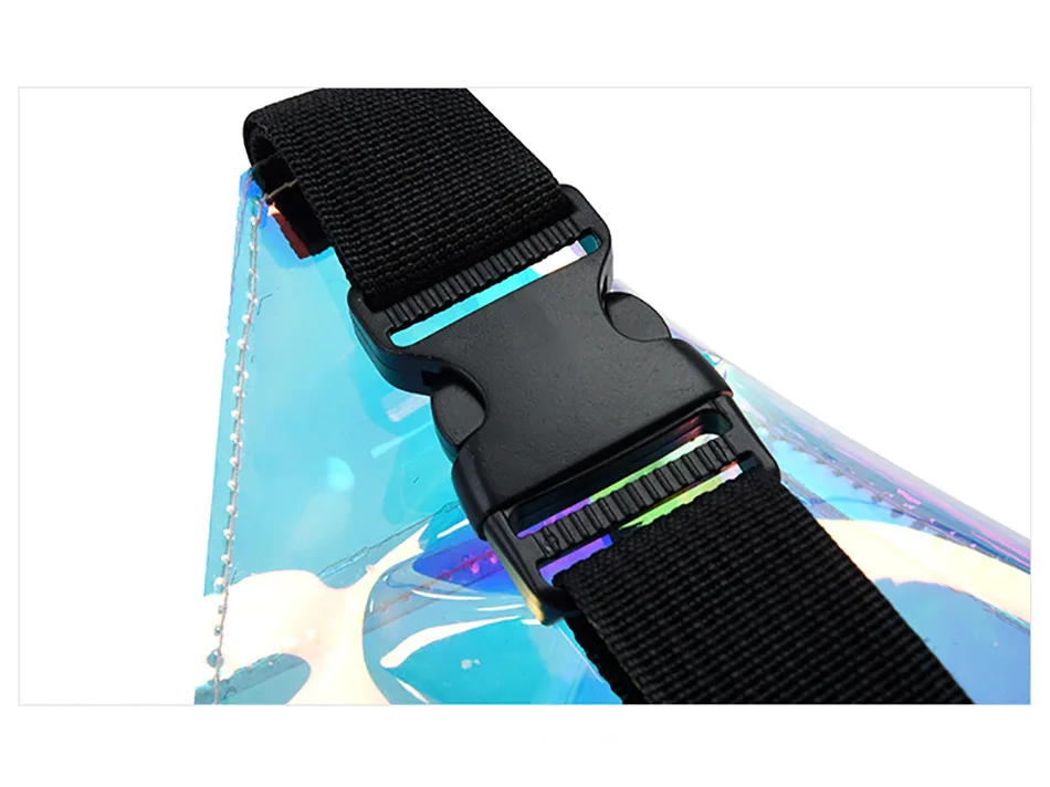 Голографическая полупрозрачная поясная сумка Поясная сумка имеет 1 карман на молнии Размеры: 32*14*8 см, ремень для ожидания подходит максимум 120 см Материал: водонепроницаемый ТПУ