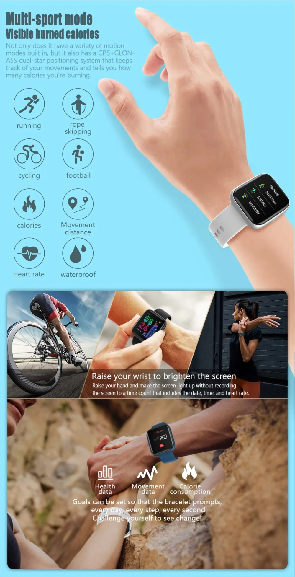 * Многофункциональные спортивные функции (пропуск, футбол, бадминтон, баскетбол, бег, Велоспорт, ходьба, шагомер, расход калорий, расчет расстояния)