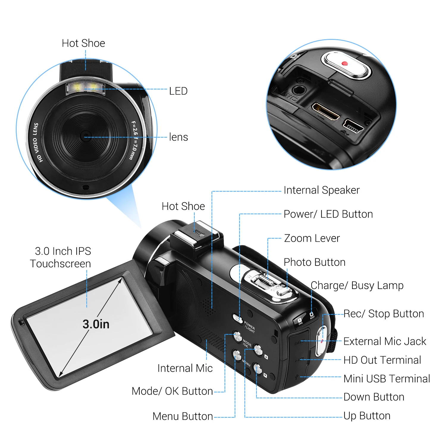 Разработан с креплением горячий башмак, который может подключить прилагаемый внешний микрофон, чтобы уменьшить шум и улучшить качество записи; С резьбой 1/4 "на нижней части камеры для крепления камеры на штативной подставке.