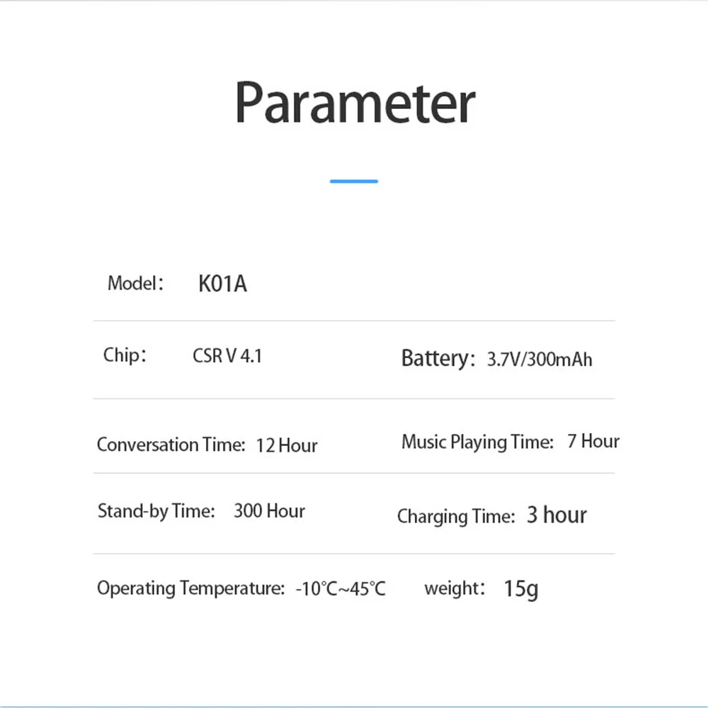 Рабочая частота: 2,4 ГГц ~ 2,48 ГГц Стандарт Bluetooth: CSR V 4,1 Протокол поддержки: HSPV1.2,HFPV1.5,A2DPV1.2 Доступное расстояние: 10 м Батарея: литиевая Батарея 3,7 V/300 мАч Время разговора: около 12 часов Время воспроизведения музыки: около 7 часов Время работы: около 300 часов Время зарядки: около 3 часов Рабочая температура: -10 °C ~ + 45 °C Температура хранения: -20 °C ~ + 45 °C