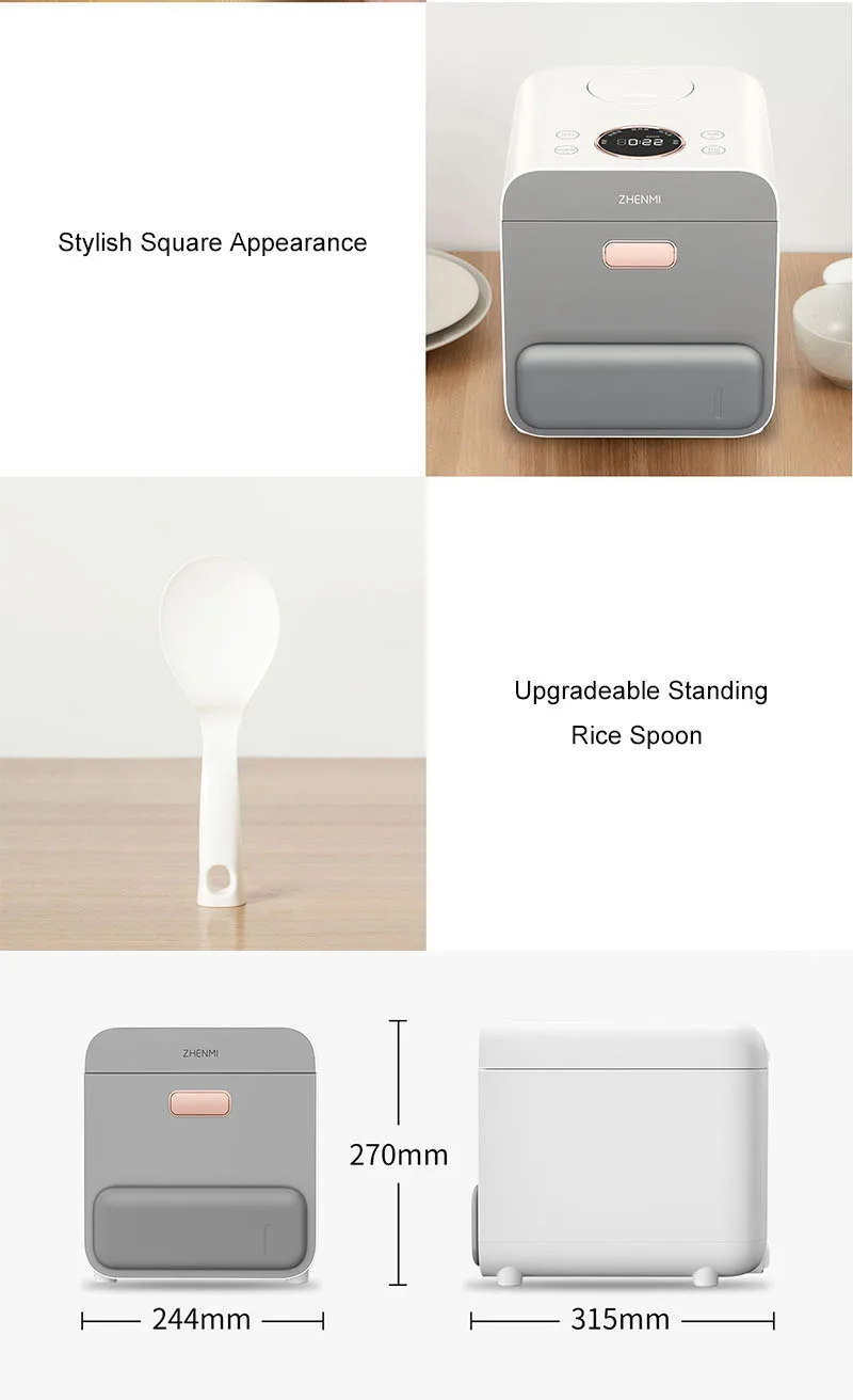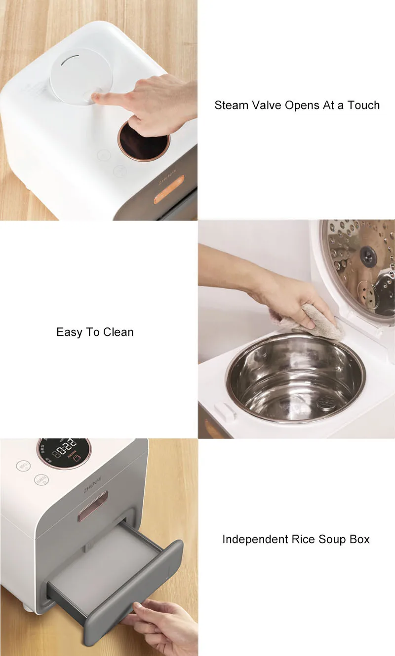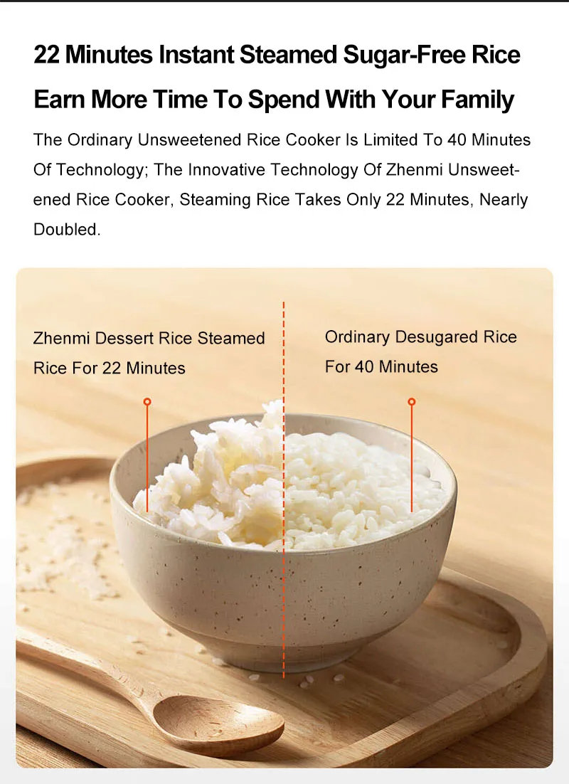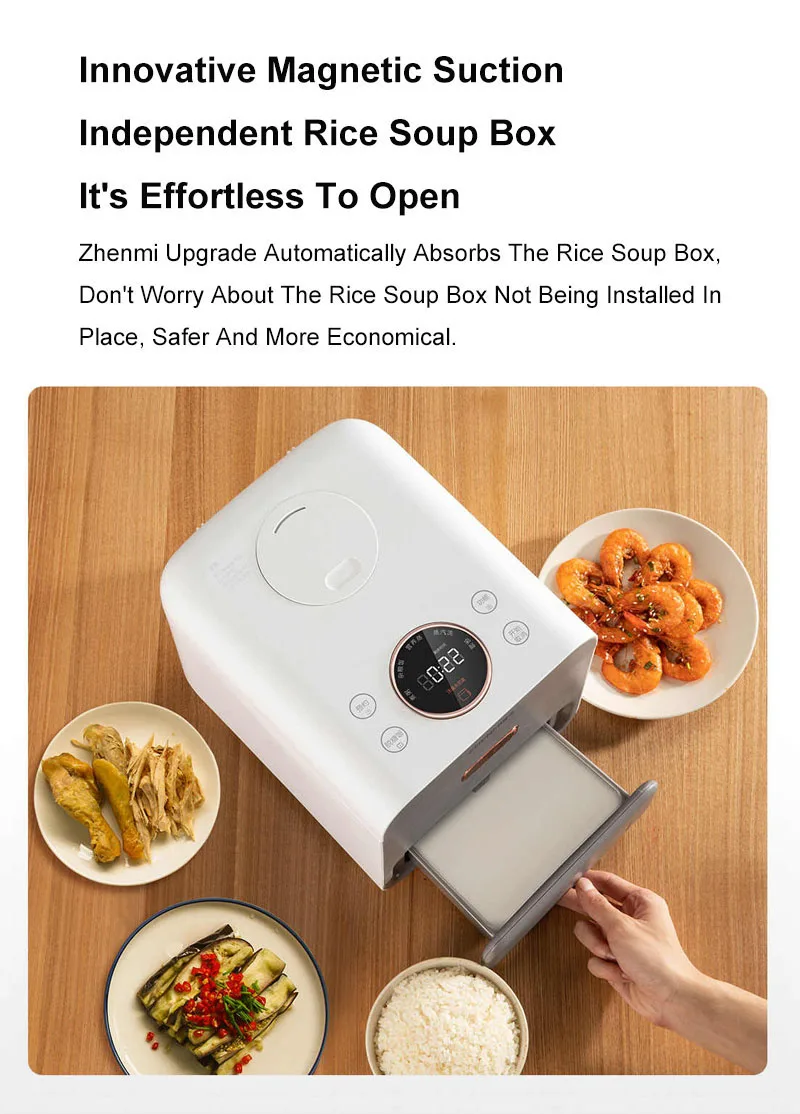В отличие от обычных кухонь Zhenmi тщательно варит рис, но не достигает температуры кипения, что позволяет вредным крахманам растворяться, сохраняя при этом жизненные питательные вещества.