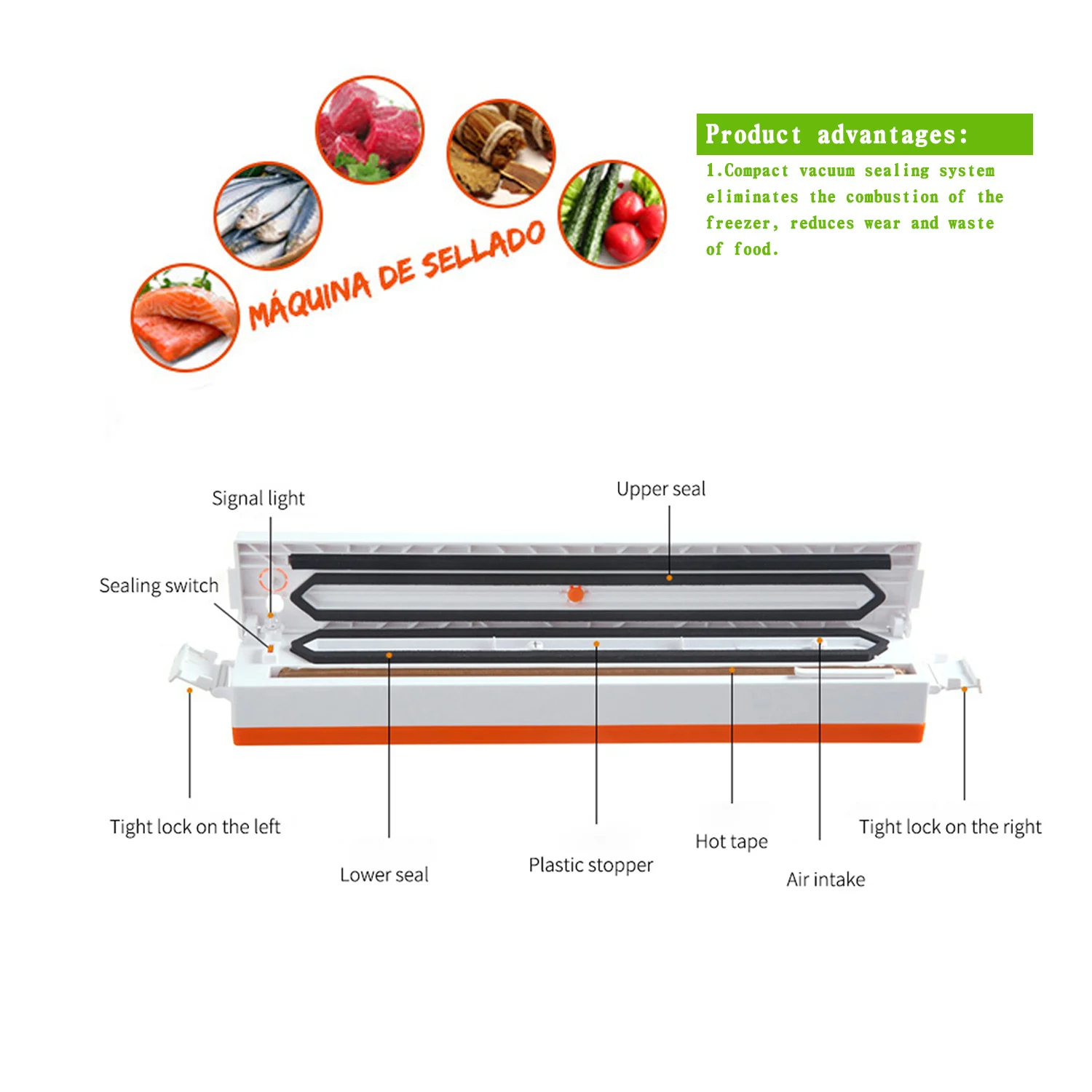Спецификация: Номинальное напряжение: AC100-240V/50-60 Гц Номинальная мощность: 90 Вт Степень вакуума: -60 кПа Размер: как показано на рисунке Применимый Предмет: сухие товары, фрукты, овощи... Вес: 0,75 кг Вилка: ЕС/США Посылка включает в себя: 1 × вакуумный упаковщик еды 15 × сумки (Размер: 25 × 20 см) 1 × руководство пользователя Внимание: 1. Для того, чтобы посылка была хорошо отправлена, мы закатываем вакуумные пакеты. Будет немного мнется, но это не повлияет на нормальное использование. Пожалуйста, не обращайте на это внимания, спасибо. 2. Машина не может быть использована для жидкости, пожалуйста, удалите влагу пищи при вакуумной герметизации. Пожалуйста, не мочите Конец Мешка, в противном случае трудно запечатать. Функция: -Вакуумный упаковщик помогает продлить срок службы пищи, так что меньше его попадает в мусорное ведро. -Автоматическое управление одним касанием с интеллектуальным светодиодный индикатором, который очень прост в эксплуатации. Включает в себя запечатывание и вакуумный упаковщик двух функций. Сделать вакуумную упаковку и запечатывание одним простым прессом. -Предотвращает рост плесени и бактерий и сохраняет питательные вещества в целости и сохранности. Устраняет ожоги морозильной камеры, уменьшает порчу и отходы пищевых продуктов. -Компактный размер и легкий дизайн для удобного хранения. Будьте осторожны с подогревом уплотнения. -Конструкция замка безопасности надежно закрывает упаковочную машину при работе, очень безопасна и предотвращает сжигание рук. Чистка и уход 1. Избегайте использования грубых материалов для очистки машины, чтобы избежать царапин на поверхности. 2. Не погружайте устройство в жидкости. 3. Перед сборкой убедитесь, что губка сухая. В процессе сборки не повредите его. 4. Тщательно высушите перед повторным использованием. 5. Запрещено протирать органическими растворителями и не нужно добавлять смазку в машину. 6. Когда машина выходит из строя, она должна немедленно выключить питание, проверить причину и удалить проблемы.