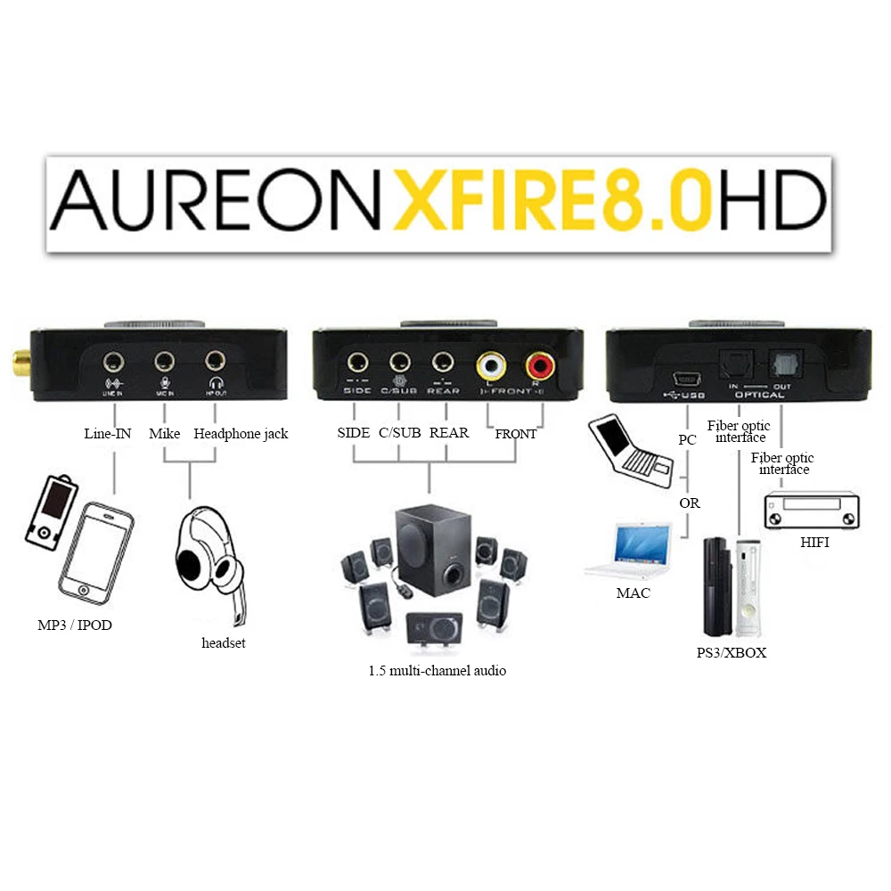Aureon Xfire 8,0 HD USB-это внешний аудиопродукт с новым дизайном, функциональными и техническими стандартами и новым опытом для пользователей MAC и Windows. Аудио высокой четкости, поддержка ASIO драйвера, поддержка полнодуплексного режима может воспроизводить и записывать аудио источник одновременно. Многоканальное 3D виртуальное объемное инновационное программное обеспечение, применяемое для цифрового управления звуком в существующей звуковой системе домашнего кинотеатра, может быть легко и удобно отрегулирован и имеет трехмерное пространство и окружающее звуковое поле Многоканальная система прослушивания приложения. Онлайн-игра, которая говорит об аудиовизуальных эффектах. PS2, X-box или другие проигрыватели видеоигр, несомненно, являются большим благом. С помощью rs можно использовать аналоговый выход USB Aureon Xfire 8,0 HD или даже волоконно-оптический выход для записи звука игры на персональном компьютере в формате высокой точности 24 бит/192 кГц, А затем создайте эксклюзивные Специальные звуковые эффекты. Например, выберите 192 кГц и 24 бит в интерфейсе Aureon Xfire 8,0 HD USB, а затем используйте программное обеспечение для записи Audacity free, И выберите частоту выборки проекта 192000 для записи высокой точности. Синий светодиодный светильник Верхняя ручка удобна для регулировки громкости и отключения звука. Позолоченный разъем используется для лучшей долговечности. Поддержка 24 бит, 192 кГц Поддерживаемые форматы аудио. 7,1 объемное звучание, подключить 2, 4, 6, или 8-канальный колонки. USB 2,0 Поддержка аудио высокой четкости (HD аудио) Превосходное качество записи, соотношение сигнал/шум до 108дб. Игра стерео 3D звуковое поле позиционирования Эффективно снижает шум окружающей среды, четкое качество звука Стерео монитор смешивания. Выберите «стерео Микс», чтобы контролировать вход и линию микрофона в стерео, отрегулируйте громкость и запись с помощью программного обеспечения для записи. Поддержка драйвера ASIO