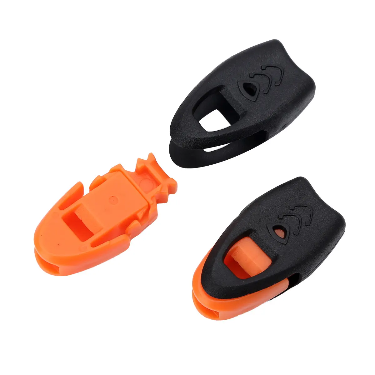 Со встроенным свистком, который громкий. Конец шнура растягивает два свободных шнура в один конец зажима.