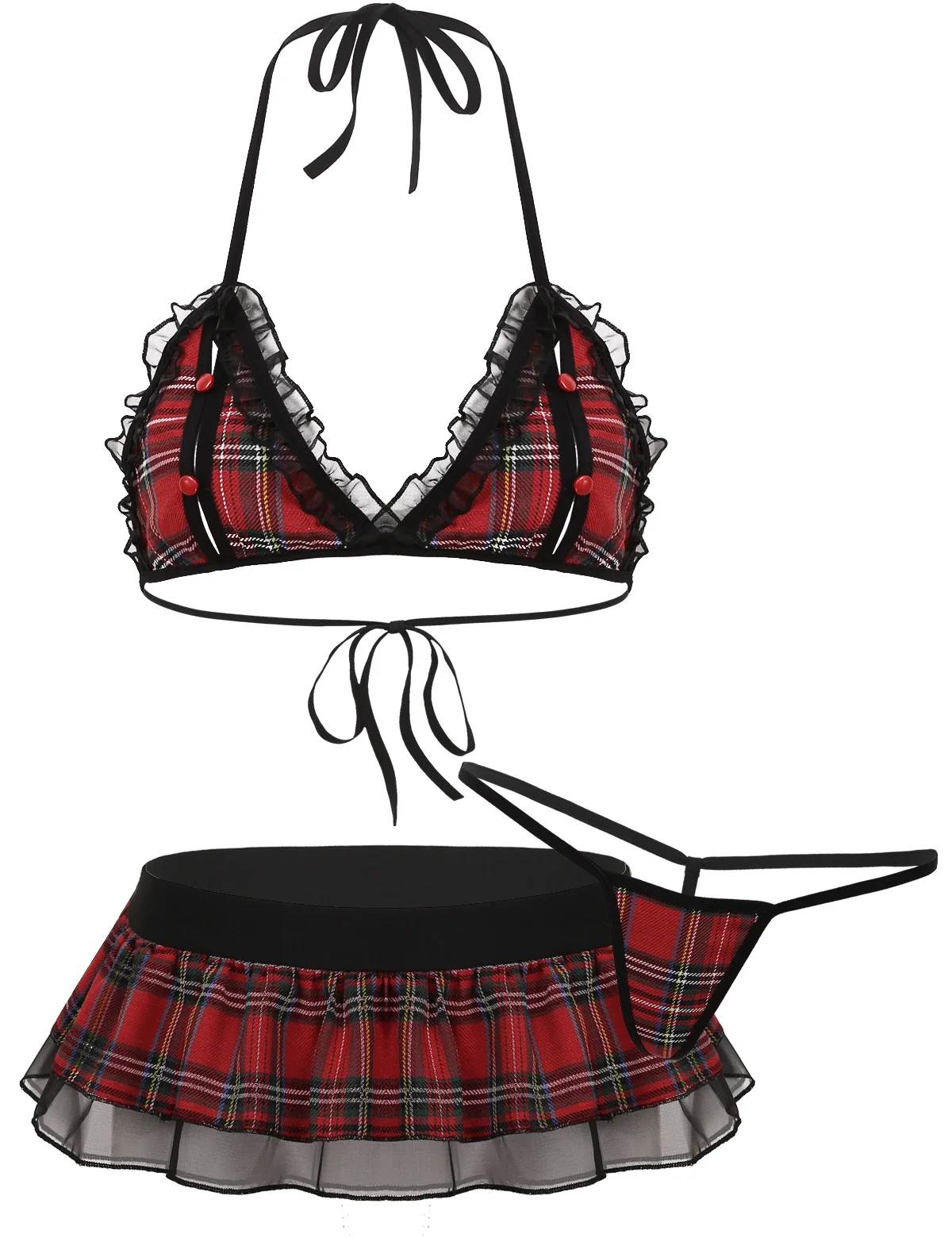 Клетчатый дизайн, горловина через шею, прорези для сосков с красными пуговицами, топ с бюстгальтером, можно регулировать по размеру.