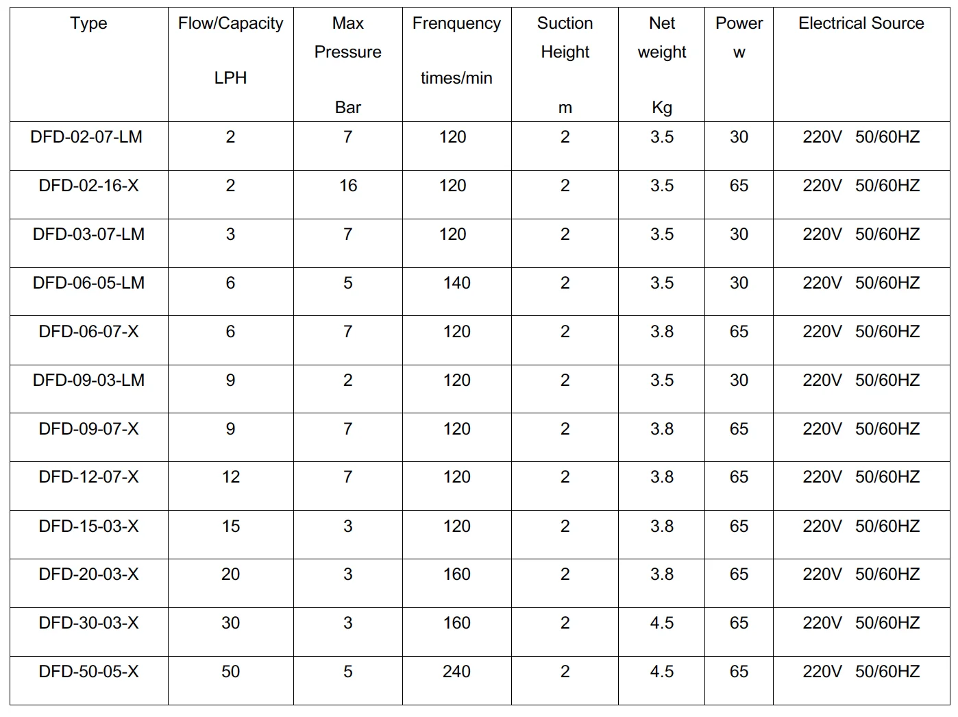 Антикоррозионный пластиковый корпус PTFE диафрагма Класс защиты: IP65 Головка насоса: PP, PVC, PTFE Всасывание и доставка клапанов: с двумя шариками каждый Ручной контроль частоты хода от 10-100%, светодиодный дисплей нормальной частоты (при беге или остановке). Источник питания: 220 В переменного тока, 50 Гц однофазный