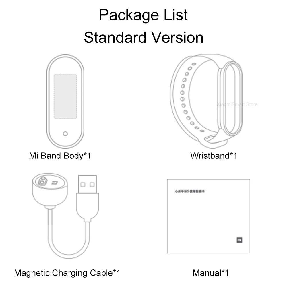 XiaoMi Band 5 глобальная версия: в наличии сейчас. (без NFC) Дисплей ------------------- 1,1 "AMOLED дисплей Аккумулятор ------------------------------------ прочность батареи 125 мА · ч, до 14 дней (время подзарядки ~ 2 часа) Водонепроницаемость ------ 5 АТМ водонепроницаемость до 50 м Отслеживание активности ------- подсчитывайте шаги, расстояние, сожженные калории, монитор здоровья женщин Здоровый мониторинг ---- 24/7 мониторинг сердечного ритма Сенсор ------------------- 3-осевой акселерометр, 3-осевой гироскоп, Подключение --------------- Bluetooth 5,0 Системные требования ----- Android 5,0, IOS 10 или выше Другие особенности: 1. Секундомер/2. Будильник/3. Таймер/4. Найдите мой телефон/5. Разблокировка телефона/ 6. Напоминание о событиях/7.не беспокоить режим/8. Блокировка экрана/9. Управление музыкой на диапазоне/10. Легко заряжается с помощью магнитных зарядных штифтов/11. Дистанционное управление фотокамерой/12. Женский монитор здоровья Посылка: Mi smart band 5 Body * 1 Ремешок на запястье * 1 Специализированный Магнитный зарядный кабель * 1 Руководство пользователя * 1