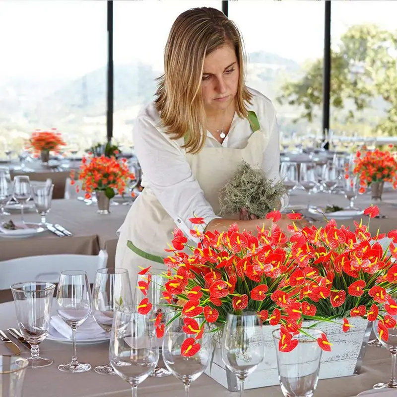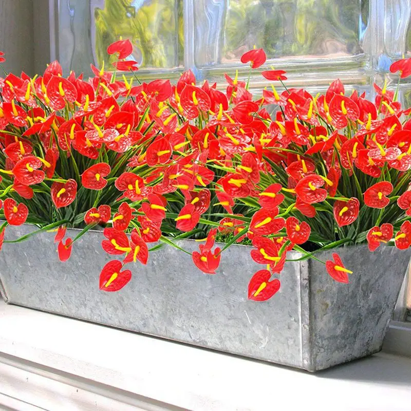 (Легко ухаживать)-искусственные антуриевые растения, солнечный свет весны для вас в любое время, без осени и никогда не увядает. Эти пластиковые цветы никогда не отмернут и легко позаботятся о них против ожесточенного шторма ветра и инсоляции.