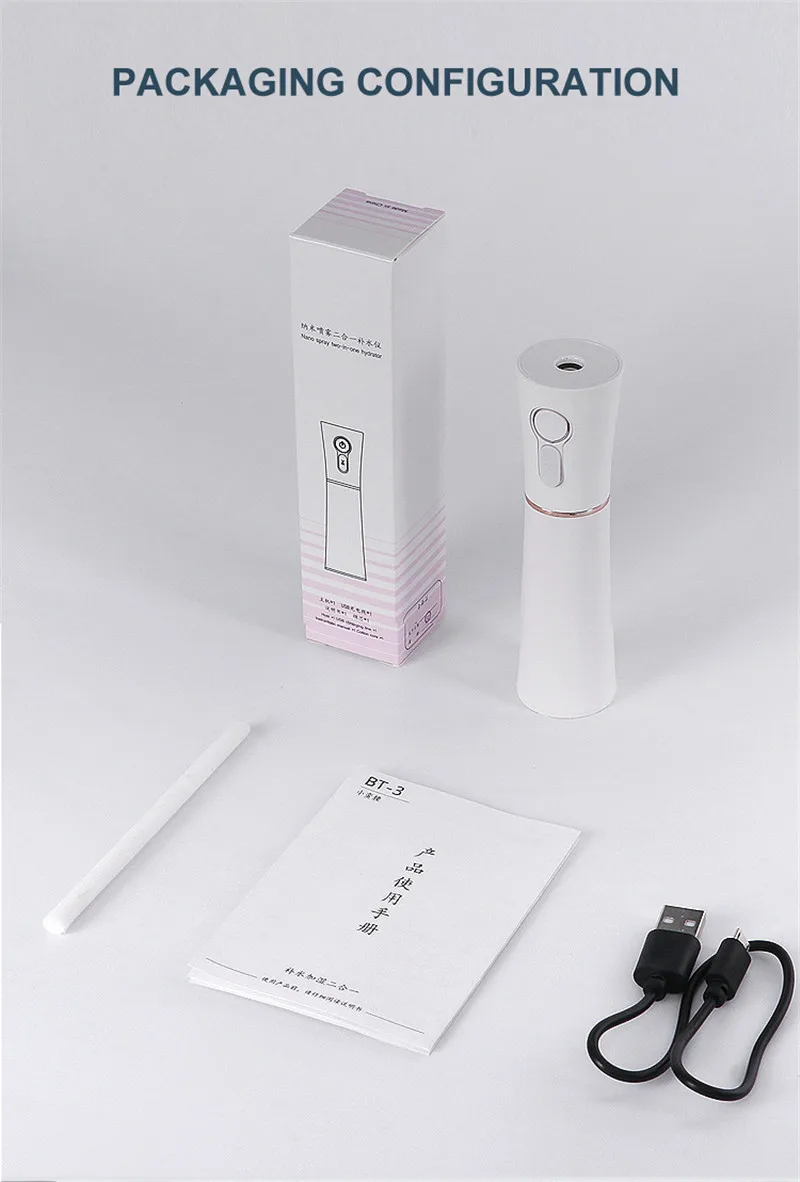 Название продукта: прибор для добавления нано воды Емкость аккумулятора: 550 мАч Емкость резервуара для воды: 40 мл Мощность зарядки: USB Цвет: белый Материал: изделия ABS Вес нетто/вес брутто: 35 г/55 г Размер упаковки: 14.2x3.3x3.3см
